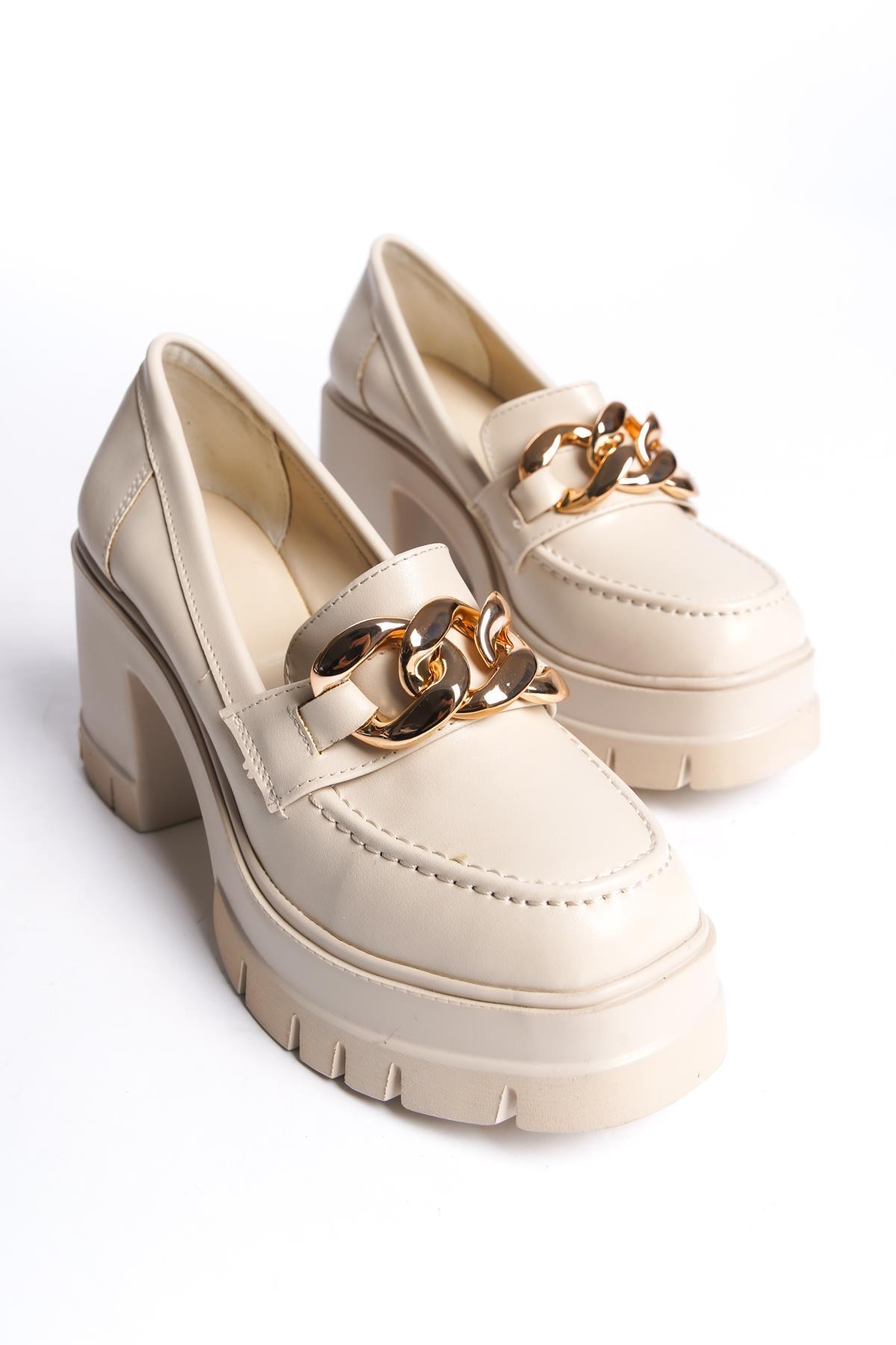 Sade ve şık tasarımıyla her ortama uyum sağlayan düz desenli kadın konsa bej yüksek topuklu leofer ayakkabı, günlük kullanım için idealdir