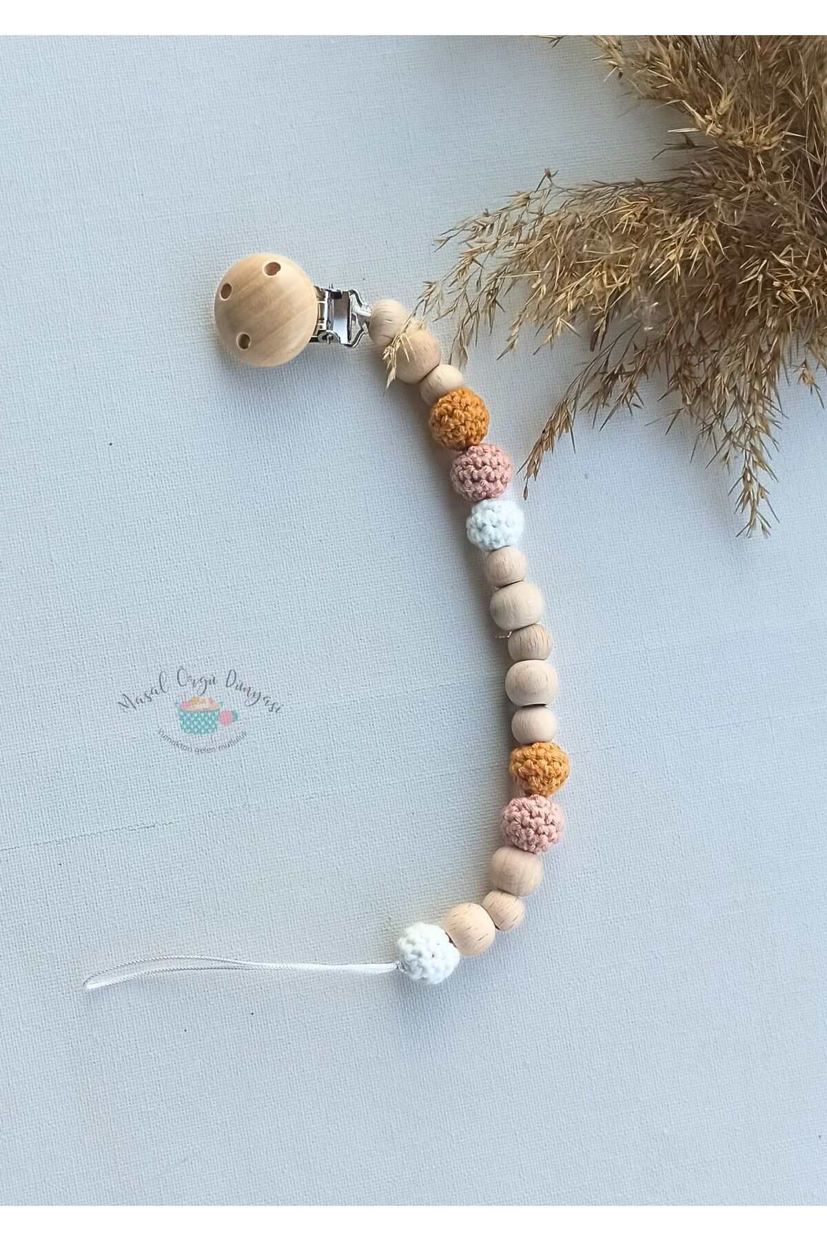 Knitted with the warmth of wooden materials and the healthy properties of natural threads, this pacifier chain focuses on your baby's health and safety while also offering him an entertaining experience. Moreover, this chain, knitted with the mother's love and effort, will have a special meaning for your baby and will be a gift that will be remembered for generations.