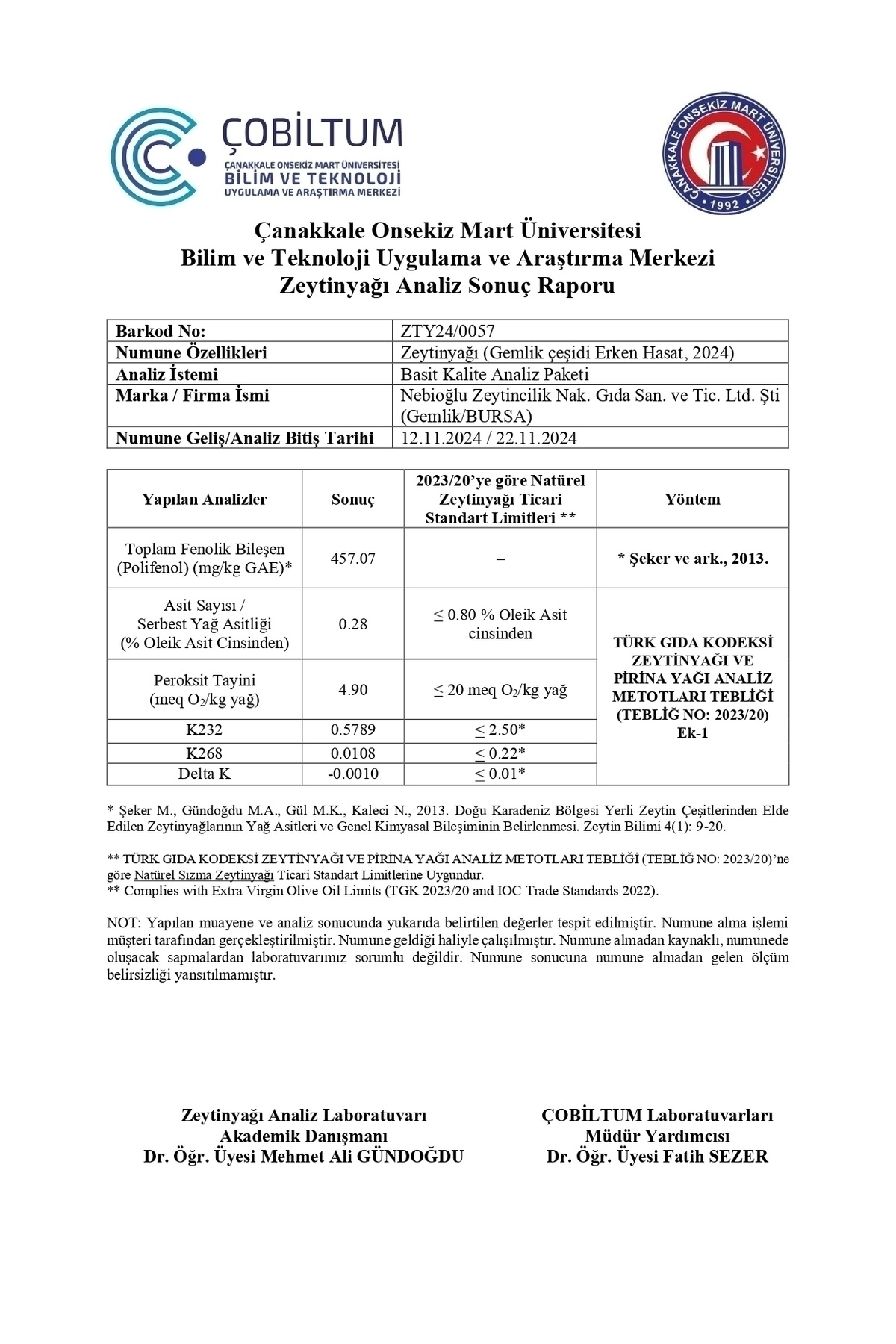 Üniversite Analiz Raporlu 457 Polifenol 0.3 Asit Naturel Sızma Zeytinyağı 250 Ml