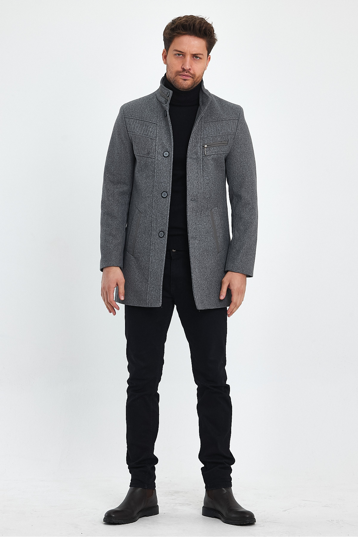 Kalın yapısı ile soğuk havalarda sıcak tutan ve konforlu bir kullanım sunan erkek dar kalıp antrasit kaşe kaban