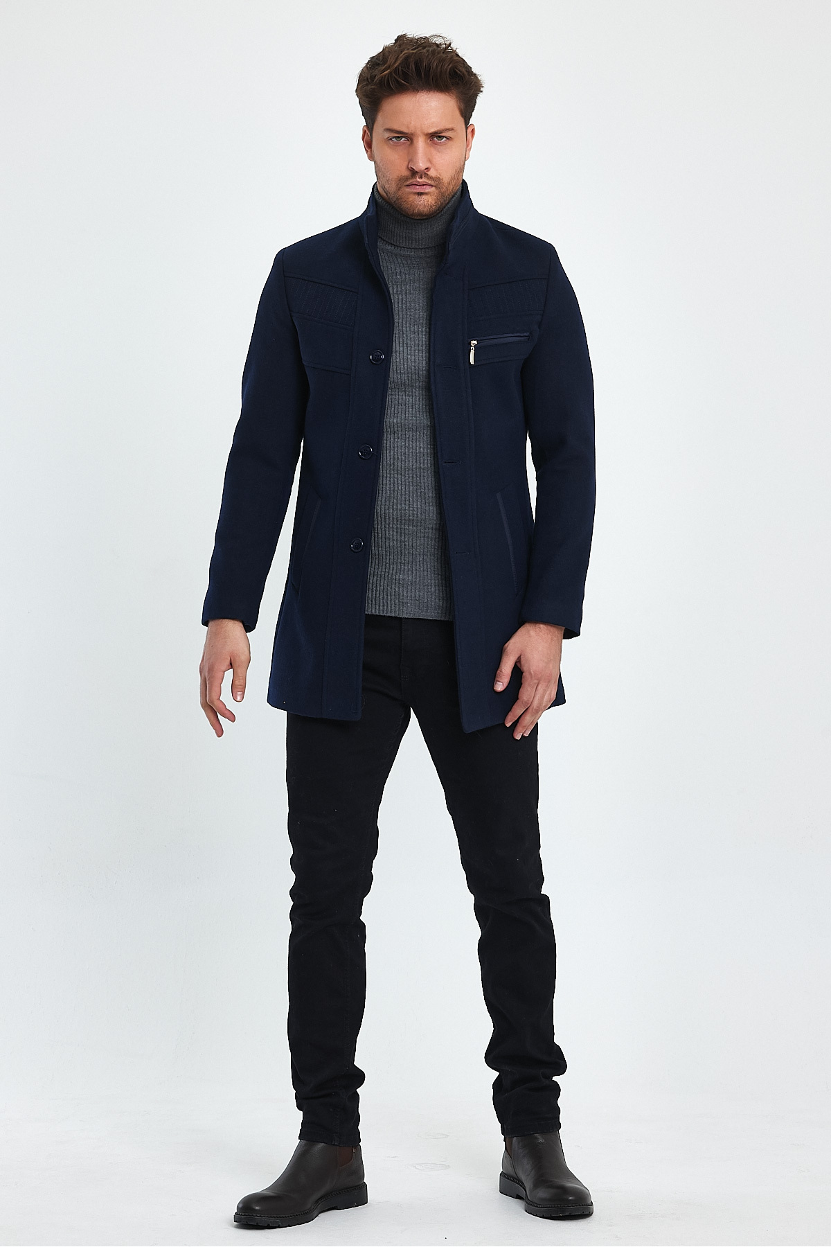 Günlük kullanıma uygun tasarımıyla şıklığı ve rahatlığı bir arada sunan düz kesim kaşe kaban