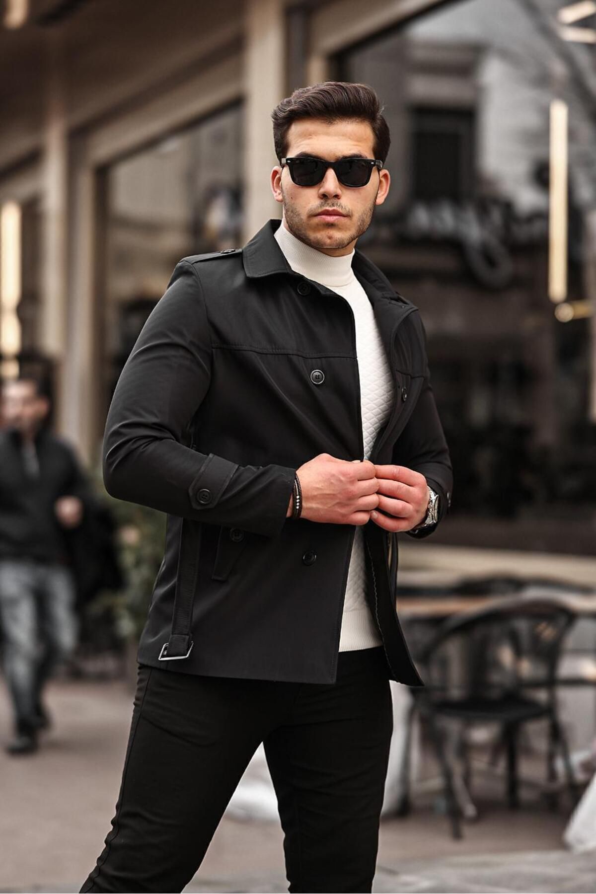 Modern ve şık tasarımıyla dikkat çeken siyah trençkot, günlük kullanım için idealdir.