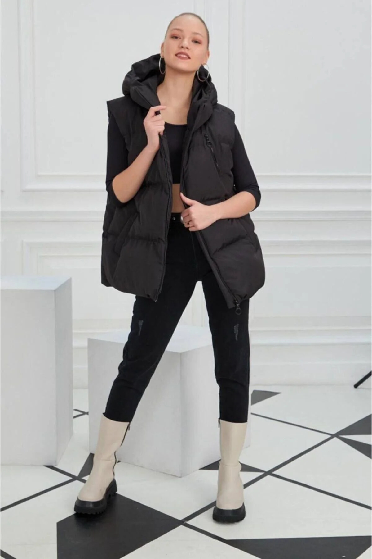 Fermuar detayı pratik kullanım sağlar ve kolayca giyilip çıkarılabilir