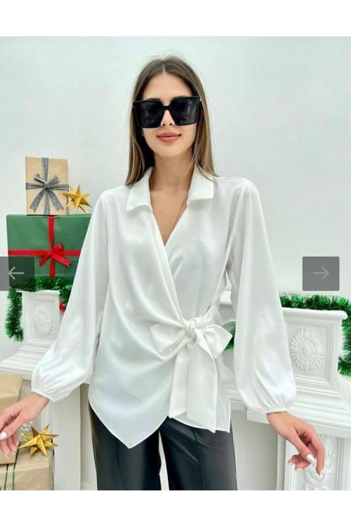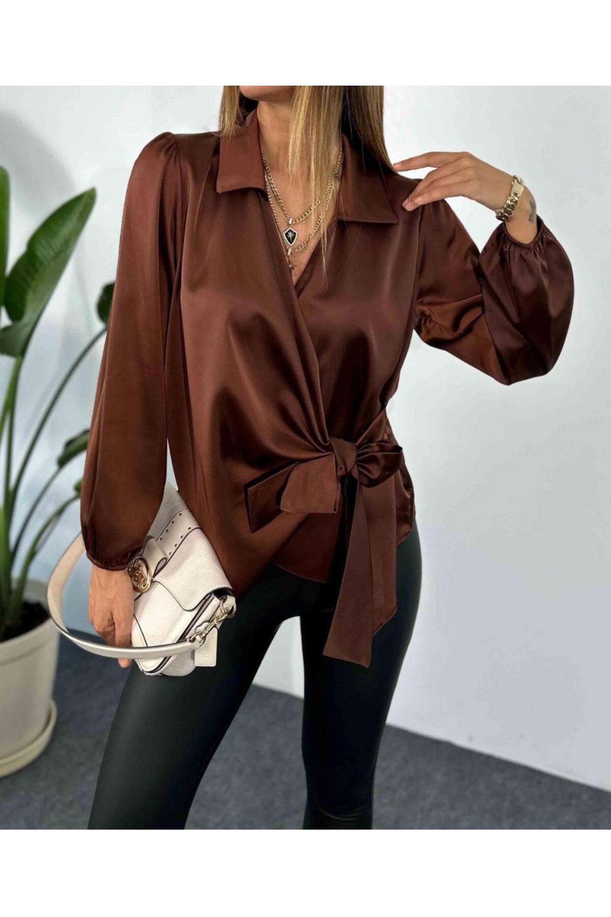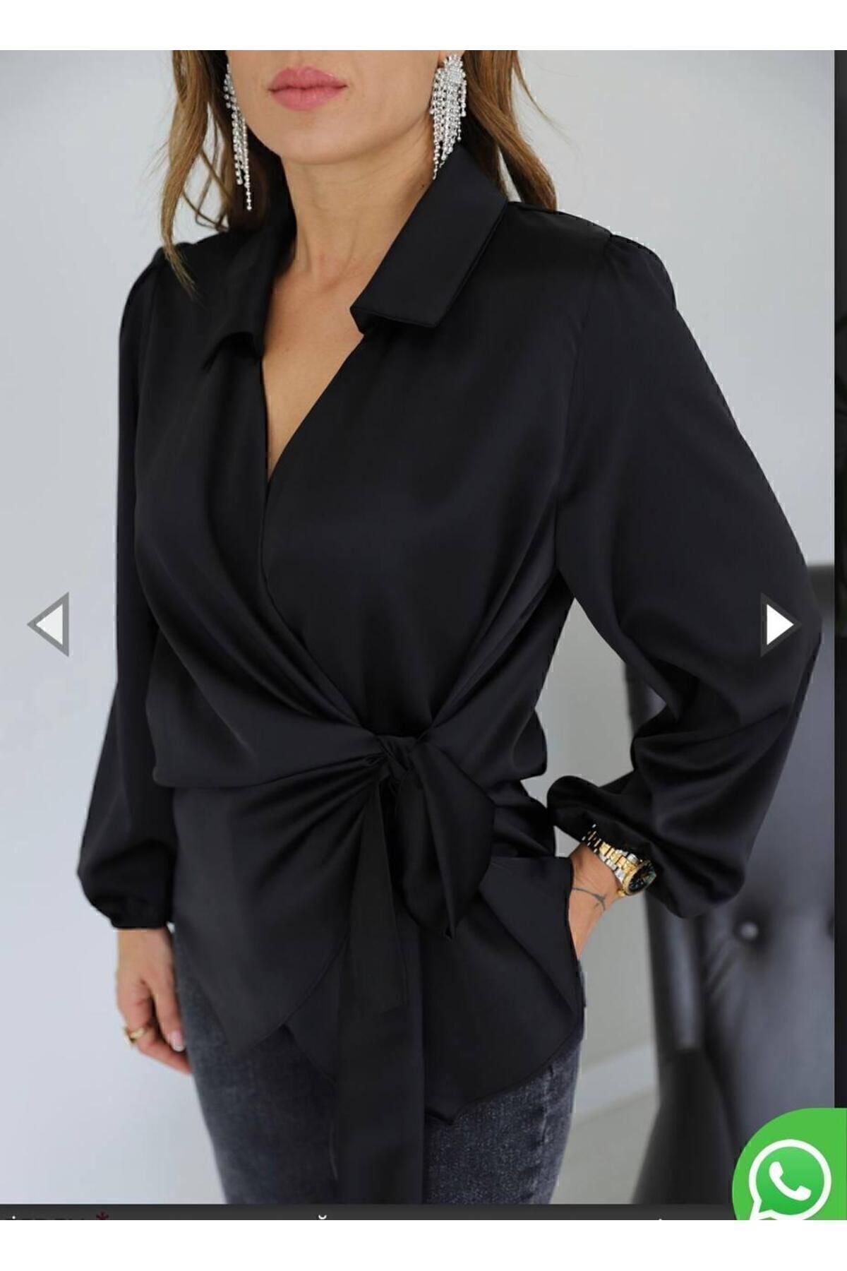 Kruvaze yaka tasarımı ile modern ve zarif bir görünüm sunan saten kruvaze yaka yandan bağlamalı gömlek bluz, her ortamda dikkat çekici stilinizi yansıtmanızı sağlar.