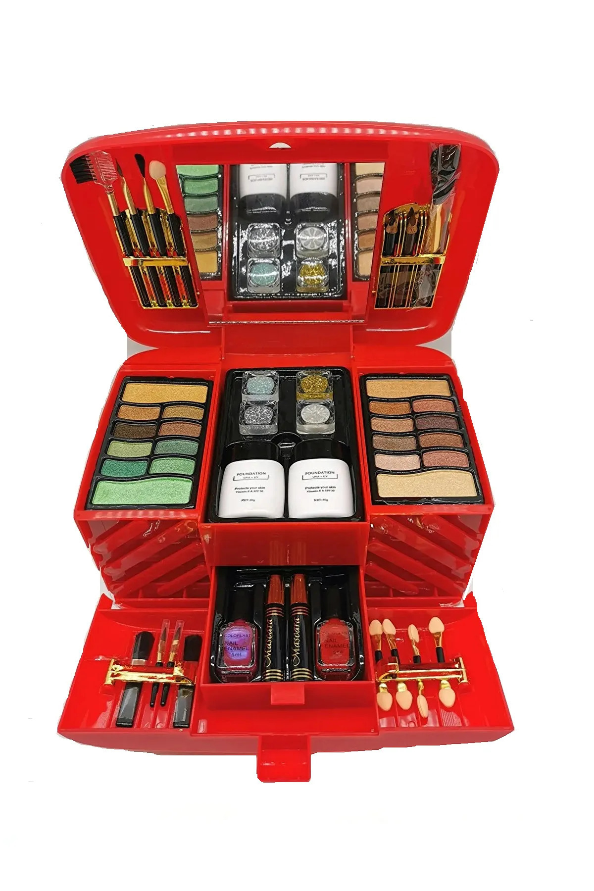 Gelinlerin vazgeçilmezi olan sandıklı büyük boy 77 parçadan oluşan makyaj seti ( Not: Ayrıca ürün ile birlikte mağazamız tarafından gelinlerimize ekstradan hediye ürün eklenmektedir ) Set içerisinde aşağıda belirtilen ürünler mevcuttur 38 adet göz farı