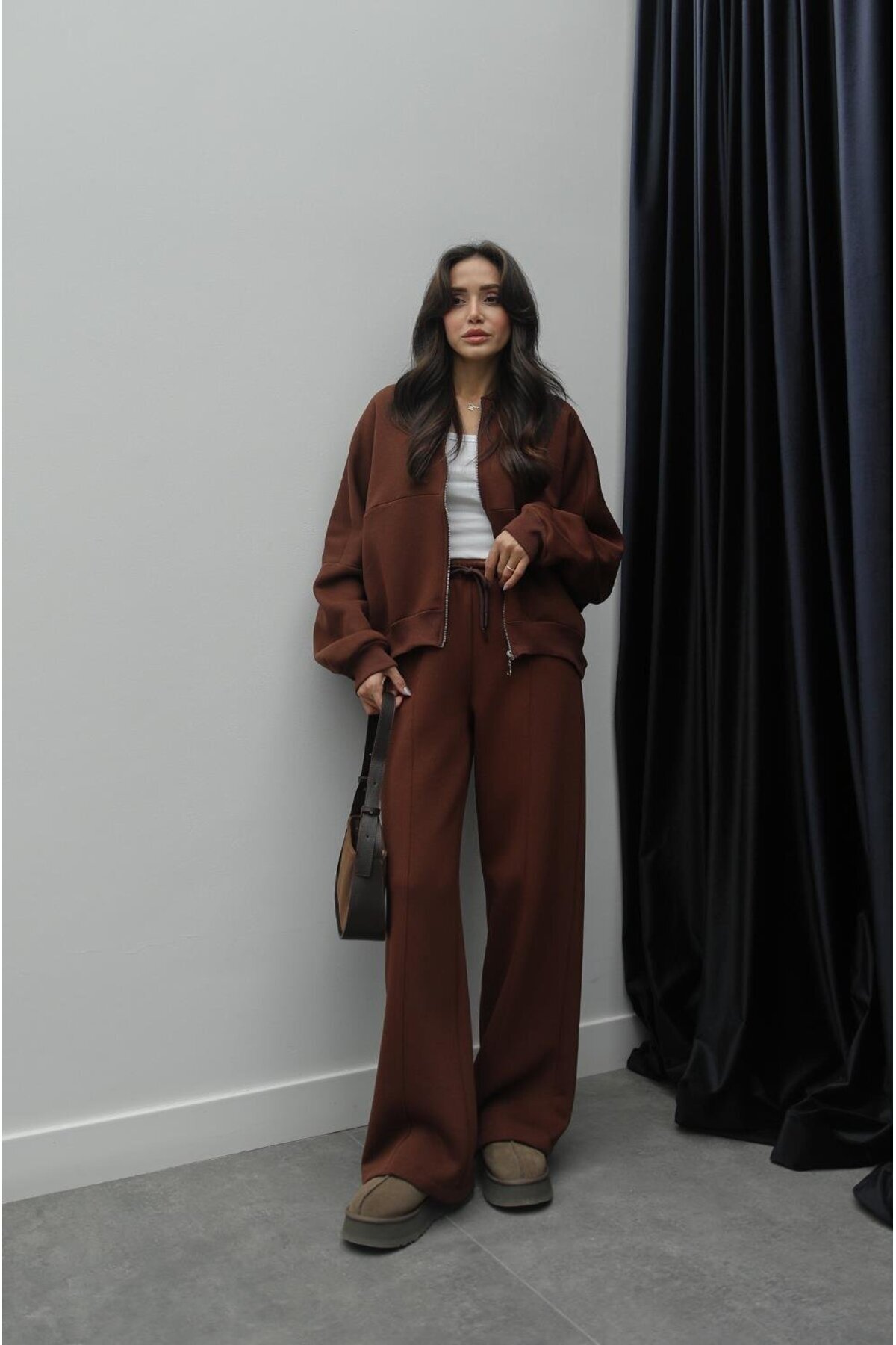 UZUN KOLLU, BİSİKLET YAKA, KENARLARI FİTİLLİ, ÖNÜ FERMUARLI SWEAT YÜKSEK BEL, BELİ LASTİKLİ VE İP BAĞLAMALI, ÖNÜ DİKİŞ DETAYLI, BOL PAÇA PANTOLON NORMAL KALIP Model Ölçüleri : 166cm / 49kg Modelin Beden : S/36 Beden Ürün İçeriği : %100 Cotton Ürün Boyu : Üst:55cm Alt:106cm
