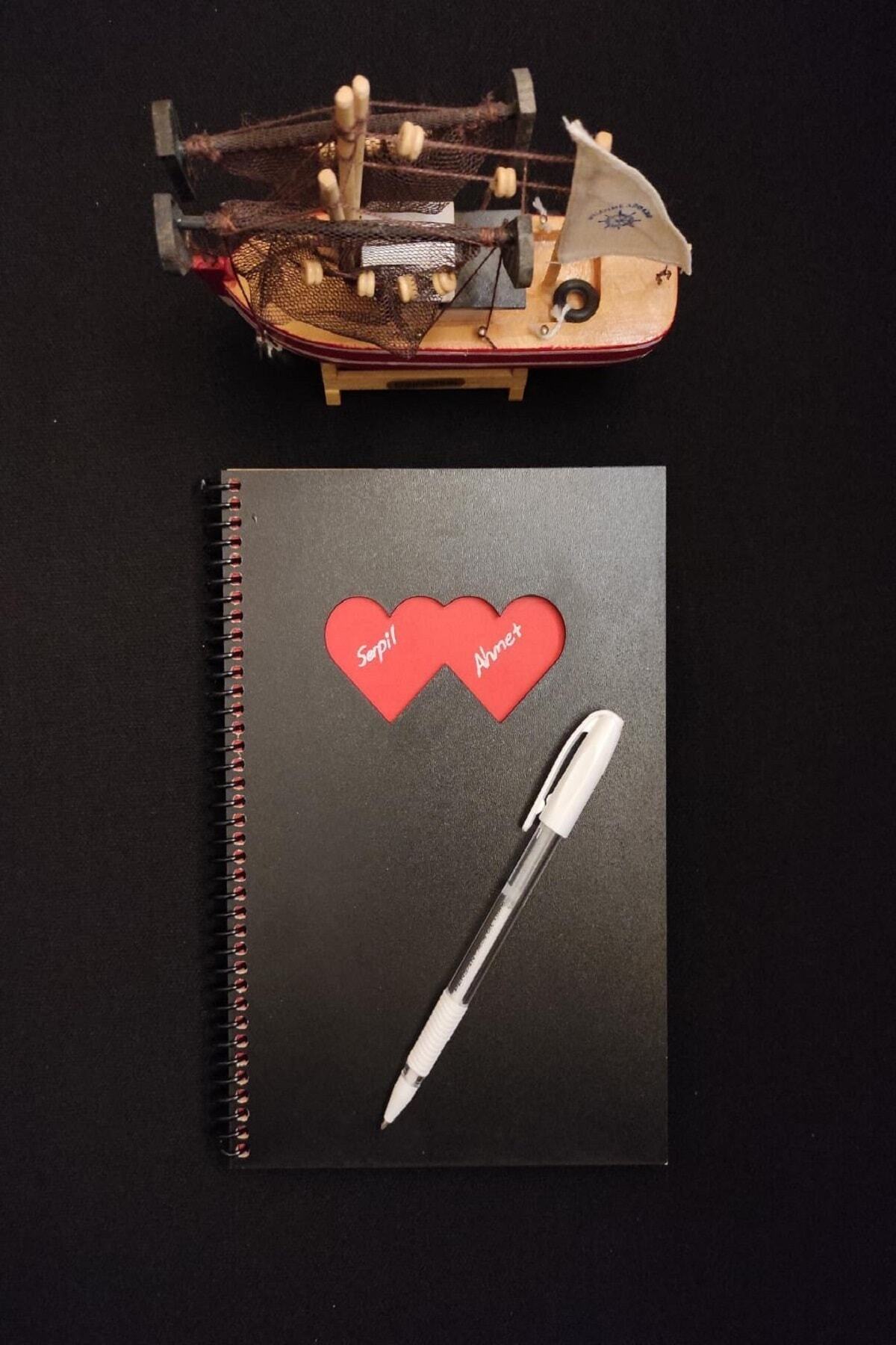 Defterin ilk sayfası kırmızı, kalan sayfaları siyah renktedir.
