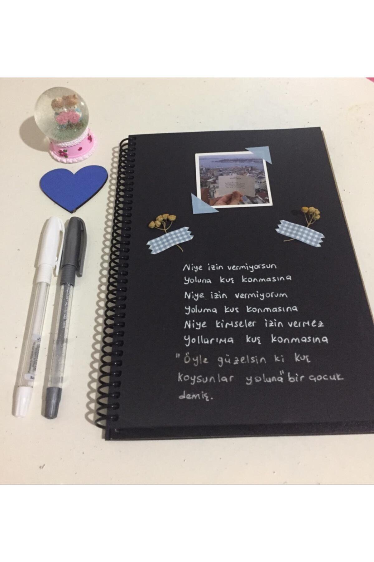 Paket içeriği: 1 Adet Siyah Yapraklı Defter, 1 Adet Beyaz Jel Kalem ve 1 Adet Renkli Bant.
