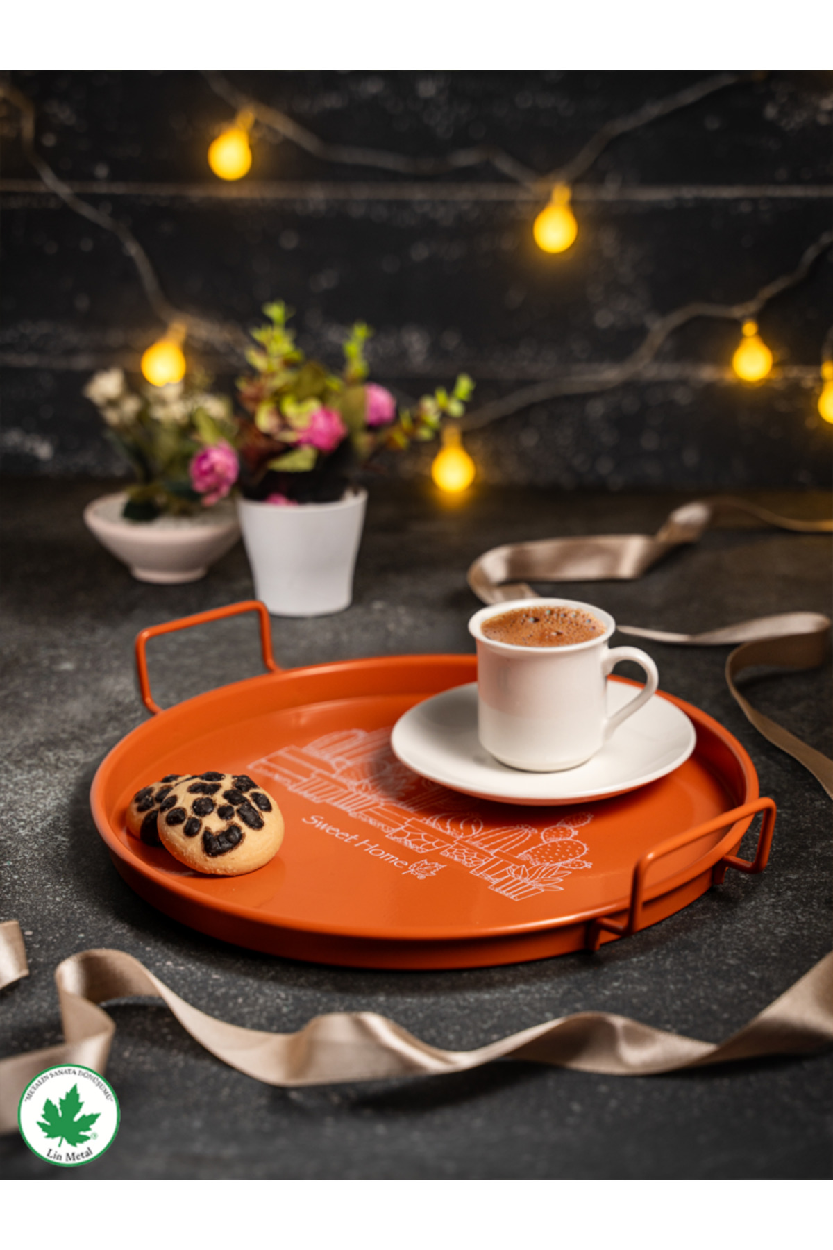 24 cm Yuvarlak Tepsi iki tane tel kulbu ve parlak altın renkli Kaktüs baskılı desen ile gelmektedir.