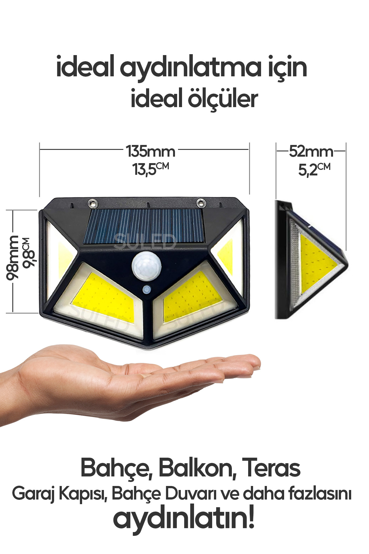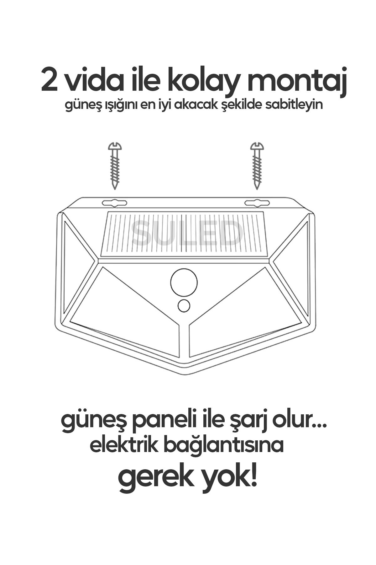 Profesyonel Sensörlü Bahçe Aydınlatma Lambası Solar Güneş Panelli Tam Otomatik 3 Modlu Dış Mekan Aydınlatma Bahçe, Evin dış duvarları, kapı üstü, bahçe çitleri ve bahçe duvarları, teras balkon gibi dış mekanlarınız için otomatik sensörlü Bahçe Led bahçe lambası, yağmur ve kar suyu geçirmez özellikteki dış mekan aydınlatma lambası profesyonel olarak dizayn edilmiştir. yüksek kapasiteli dahili bataryası gece boyunca harekete göre ve moda göre sürekli yanma gibi özellikler ile birlikte gelir. Karanlık alanlarda hareketi otomatik algılayarak maksimum güçte aydınlatma sağlar. Solar Panelli Bahçe Aydınlatması Özellikleri Paket İçeriği 4 AdetSolar Bahçe Aydınlatması