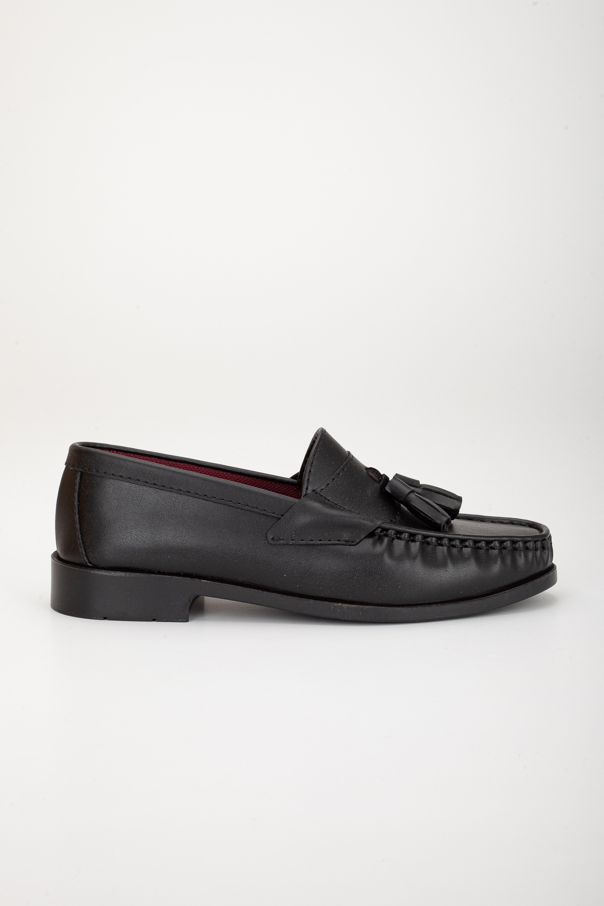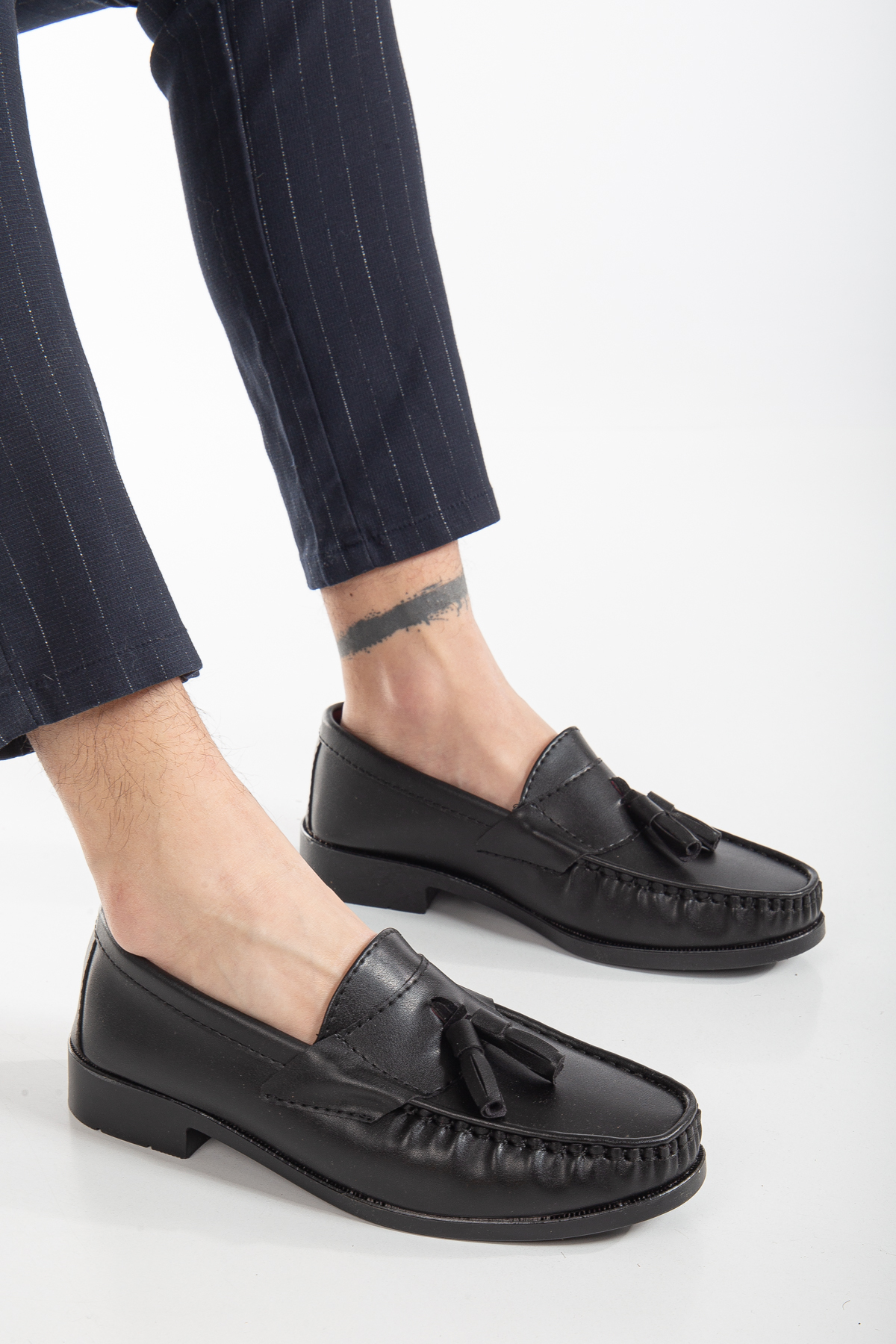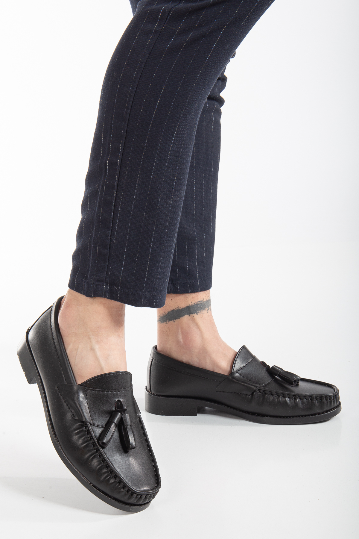 Klasik tasarımıyla her ortama uyum sağlayan siyah corcik püsküllü unisex günlük ayakkabı, hem erkek hem de kadın kullanıcılar için ideal bir seçenektir