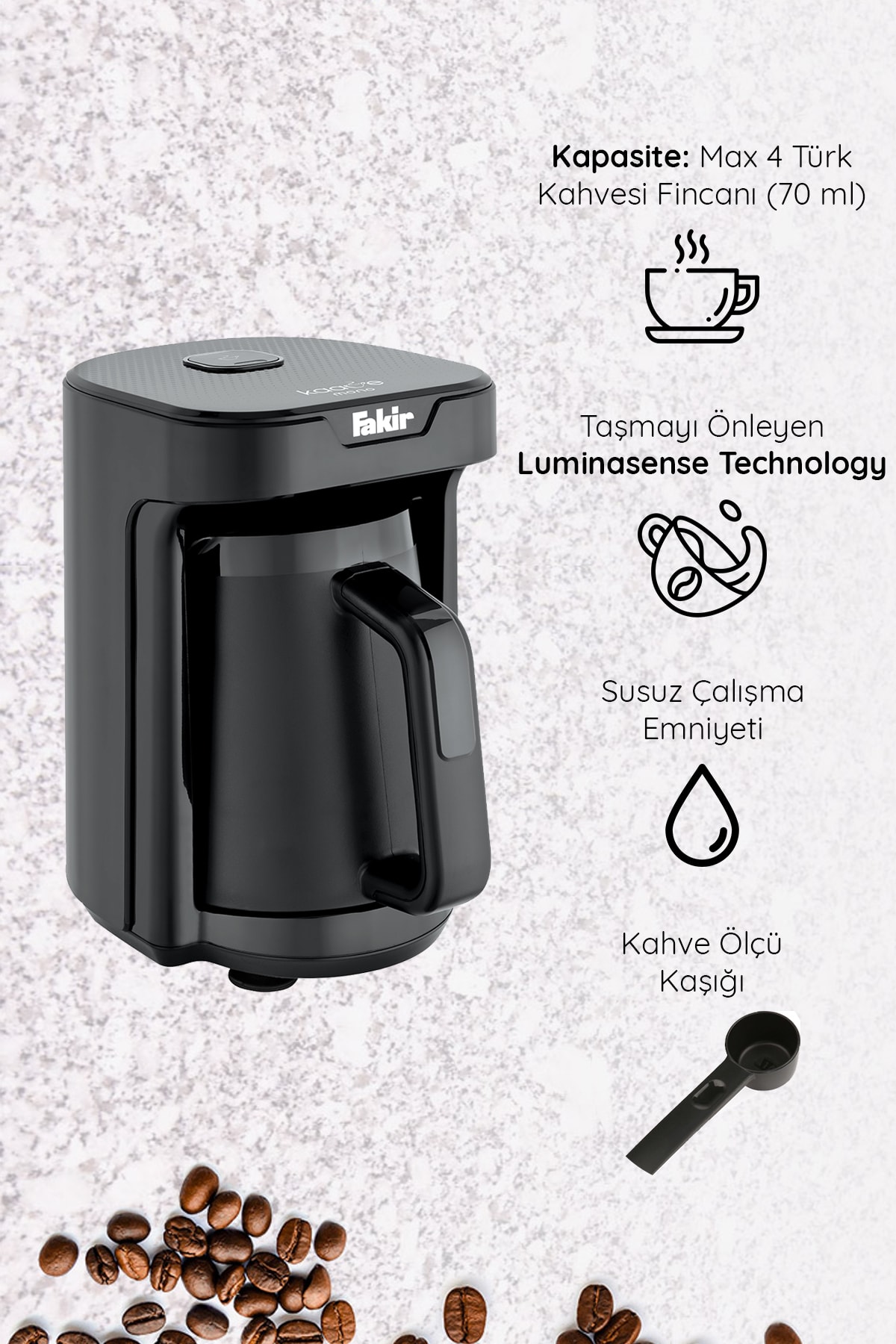 Taşma emniyeti özelliği ile kahve hazırlama sürecinde olası taşmaların önüne geçerek temiz ve düzenli bir kullanım sunar
