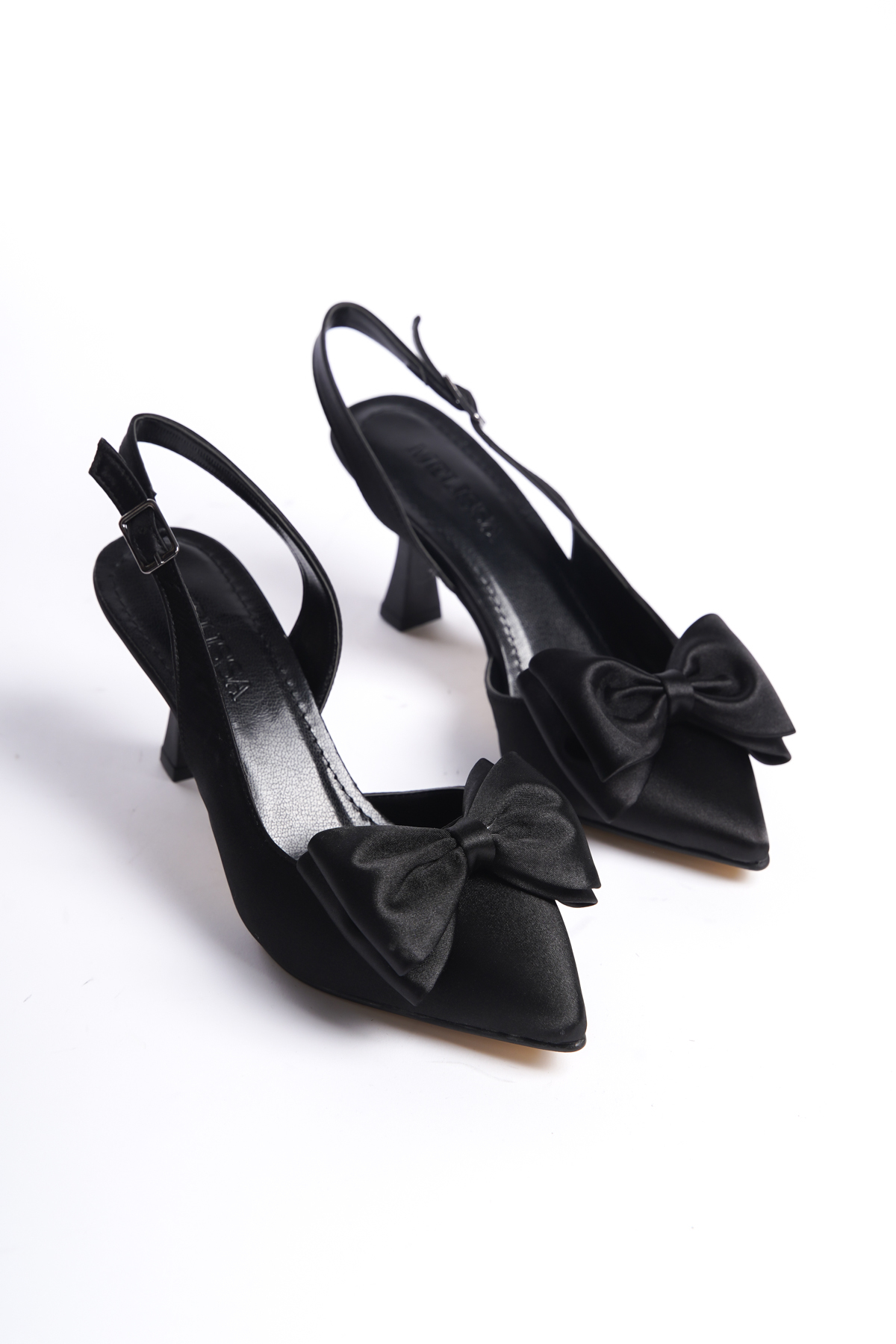 Saten kumaşın zarif dokusuyla öne çıkan siyah abiye ayakkabı, şıklığınızı tamamlayacak bir aksesuardır