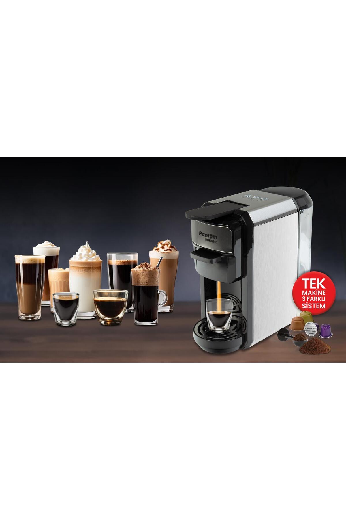 FANTOM MIXPRESSO KS 1450 MISSCOFFEE HEDİYELİ KUTU SİYAH GENEL ÖZELLİKLER Fonksiyon: Ekspresso Makinesi Güç: 1450 Watt Pompa Basıncı: 19 Bar Pompa Basıncı Hazne Kapasitesi: 0,6 Litre Su Haznesi: Çıkarılabilir Su Haznesi Standy By Modu: Var (15 Dk sonra Otomatik Standby) Küçük Büyük Bardak Seçimi: Var Manuel ve Otomatik Durdurma: Var Nespresso ve Dolce Gusto Kapsül: Var (Kullanımına Uygun) Öğütülmüş Kahve: Var (Kullanımına Uygun) Sesli ve Işıklı Uyarı: Var Enerji Tasarruf Özelliği: Var Ergonomik dizayna sahip espresso kahve makinesi 19 bar gücündeki pompası ile Nespresso/Dolce Gusto kapsül ya da öğütülmüş kahveyi özel adaptörleri ile kullanmanıza ve keyifli bir kahve yapmanıza olanak sağlar.