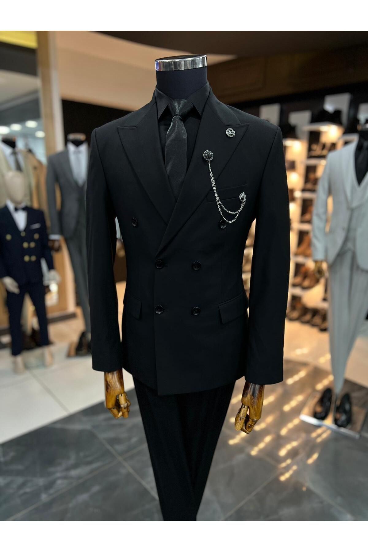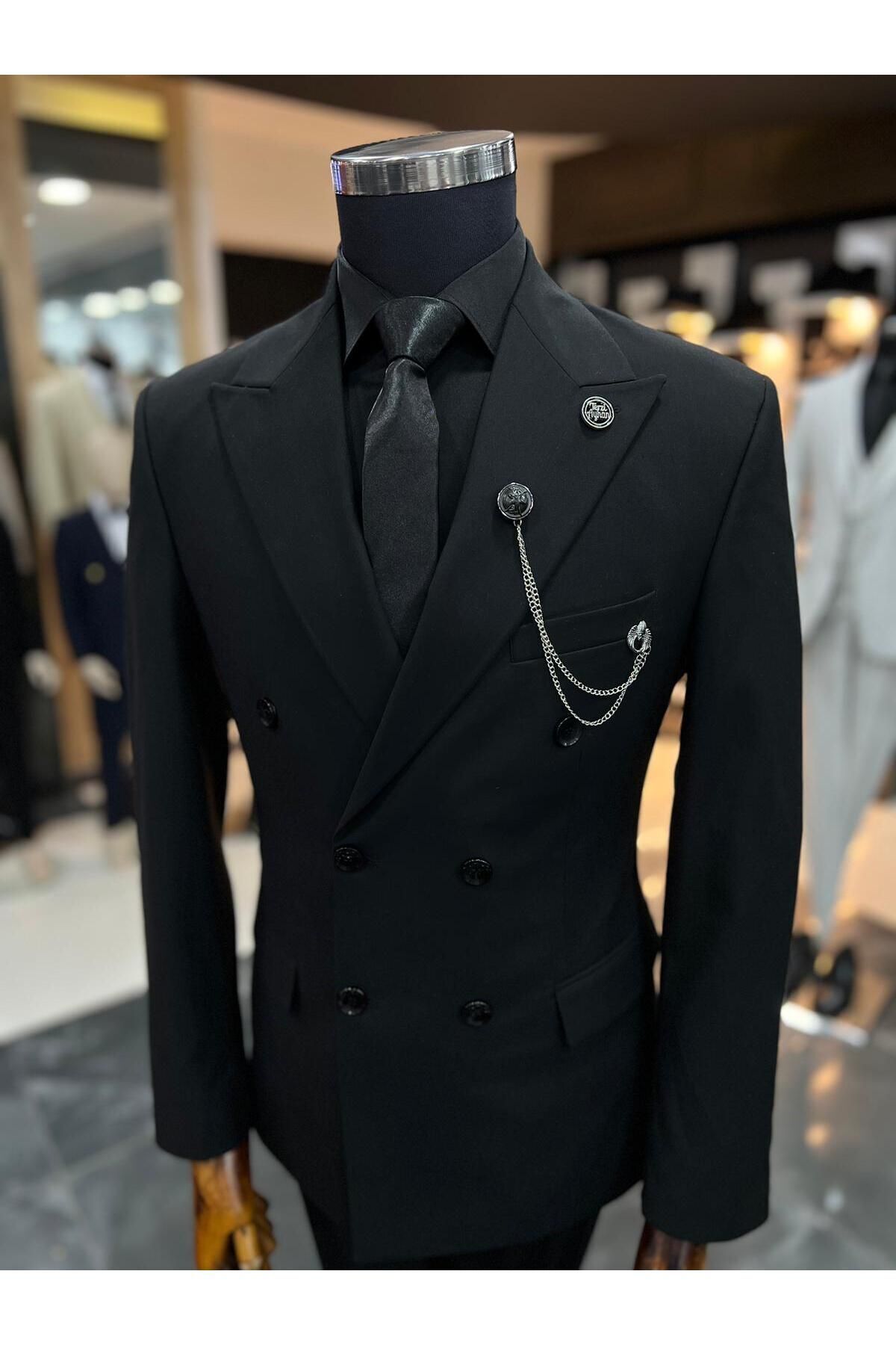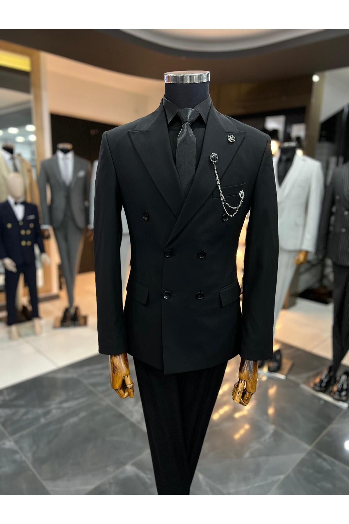 Sportswear koleksiyonuna özel tasarlanmış, modern ve şık bir görünüm sunan siyah kruvaze slimfit takım elbise