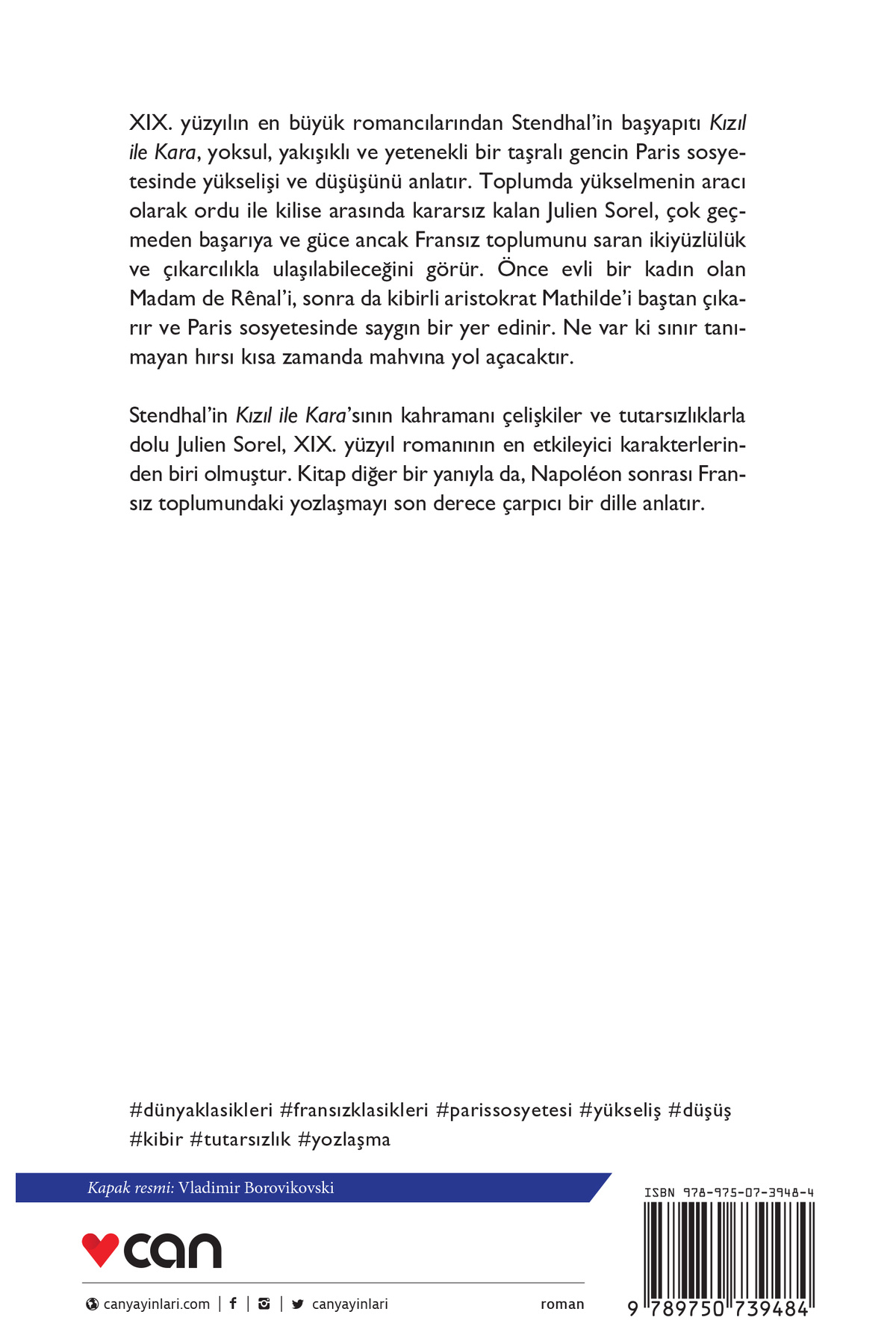 yüzyılın en büyük romancılarından Stendhal’in başyapıtı Kızıl ile Kara, yoksul, yakışıklı ve yetenekli bir taşralı gencin Paris sosyetesinde yükselişi ve düşüşünü anlatır.