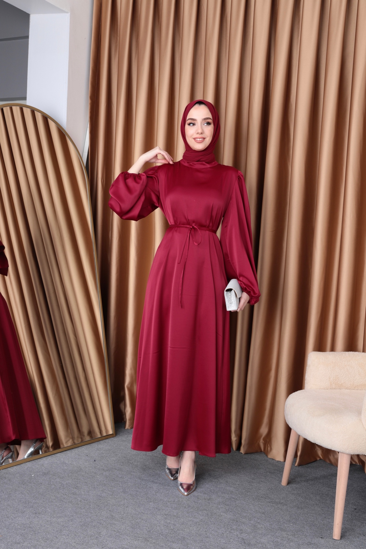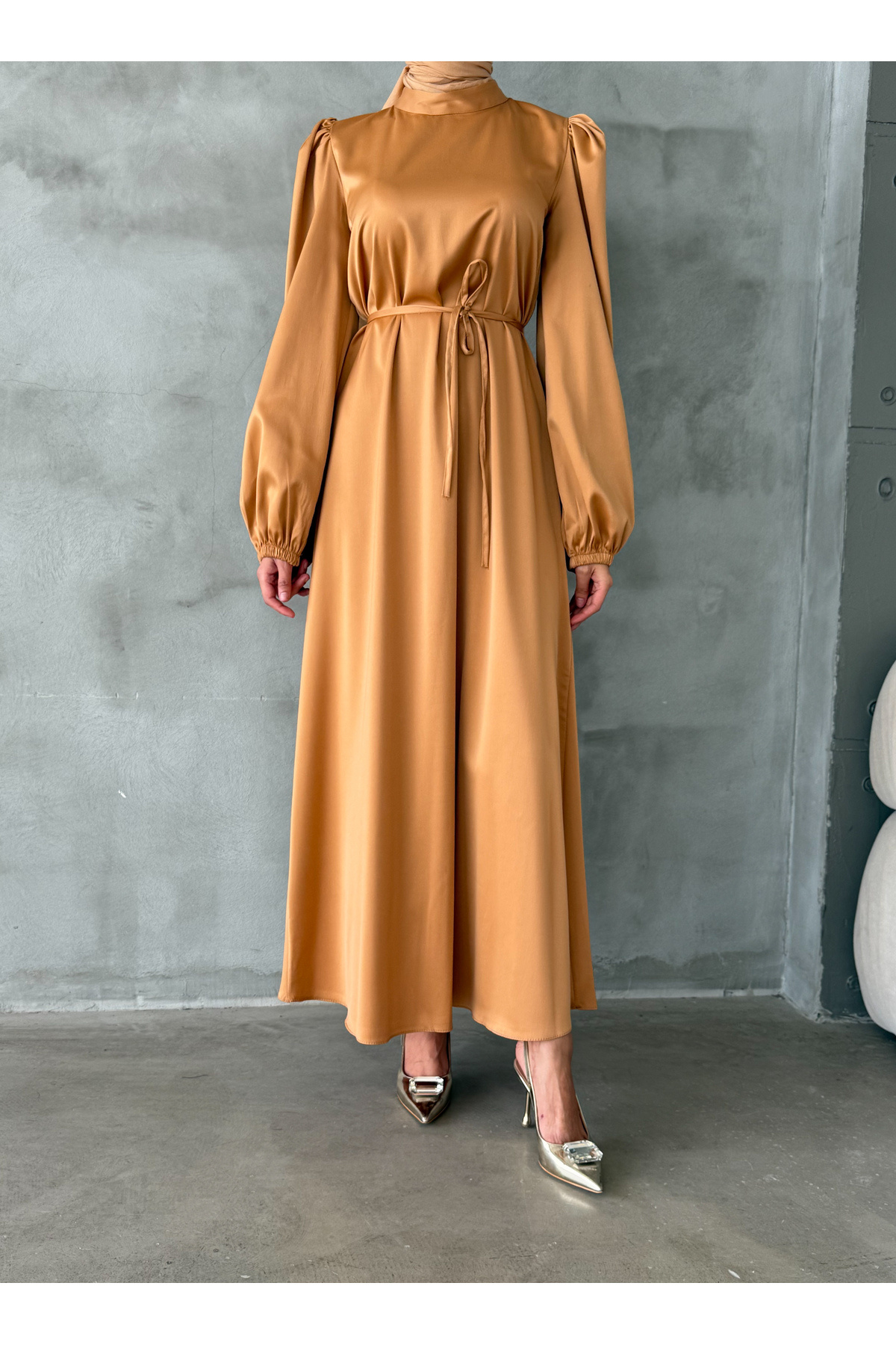 Tesettür elbisemizin kumaşı saten kumaştır