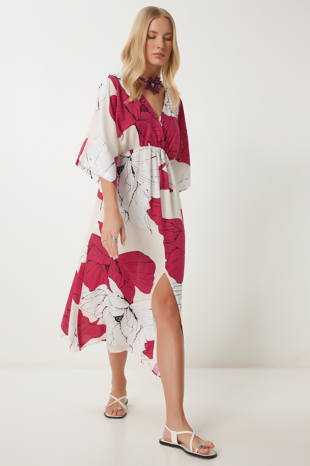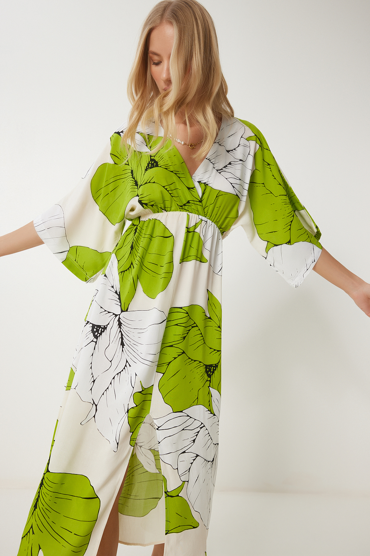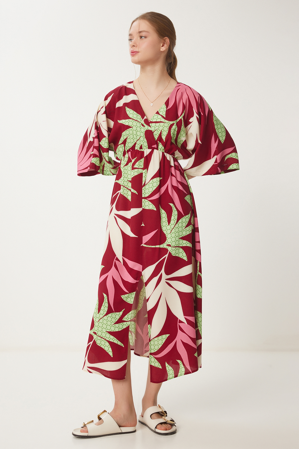 • Anvelop yaka, yarasa kol, elastik belli, önden tek yırtmaçlı, desenli viskon elbise