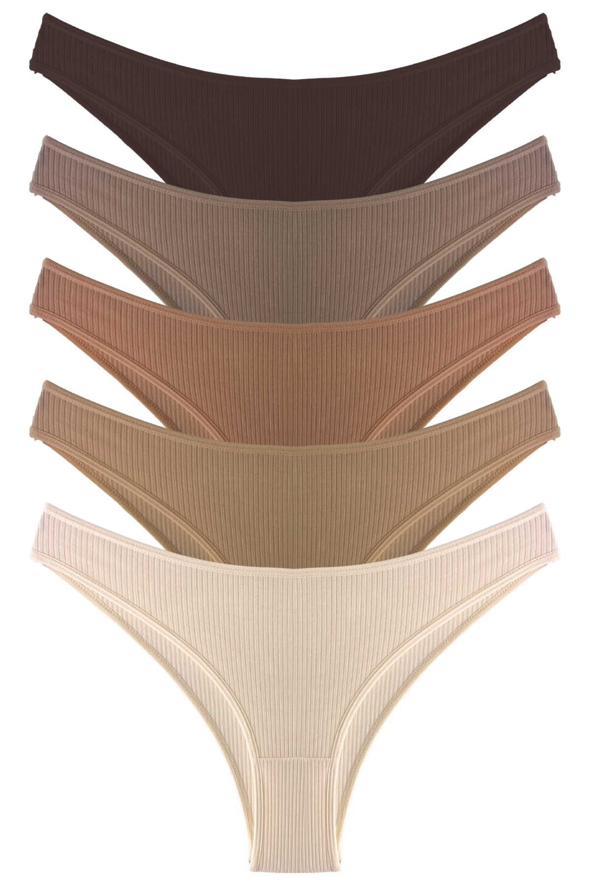 Kadın Pamuklu ve Likralı Fitilli Kaşkorse Brezilya Külot 5'li Paket Paket içerisinde 1 adet Siyah, 1 adet Pudra, 1 adet Su Yeşili, 1 adet Bej, 1 adet Bronz renk ürün bulunmaktadır.