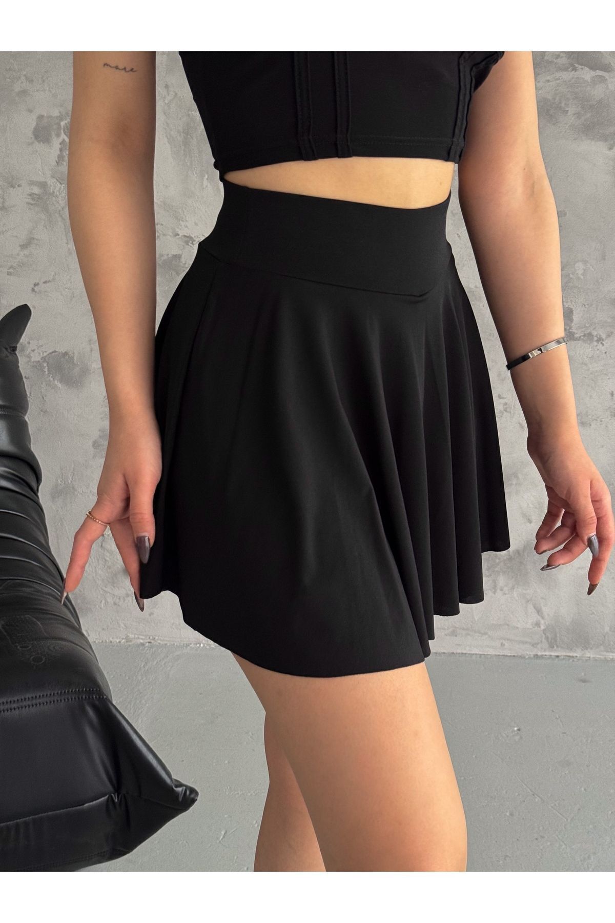 - Kloş siluetiyle bacak hatlarınıza zarifçe oturan bu mini etek, feminen çizgileri ön plana çıkarır.