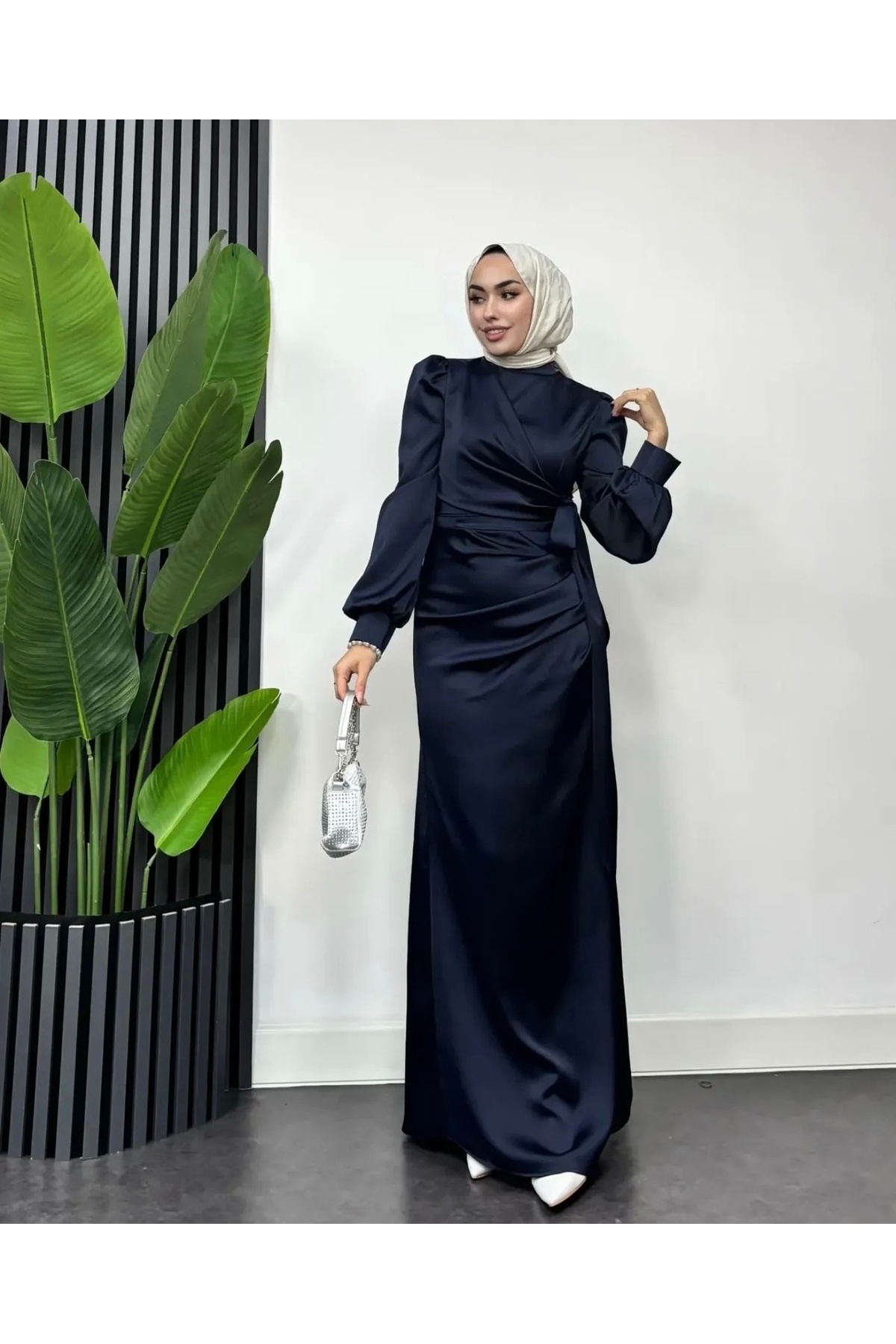 Gündüzden geceye her ortama uyum sağlayan şık tasarımıyla dikkat çeken, yanlardan bağlanabilen tesettür abiye.