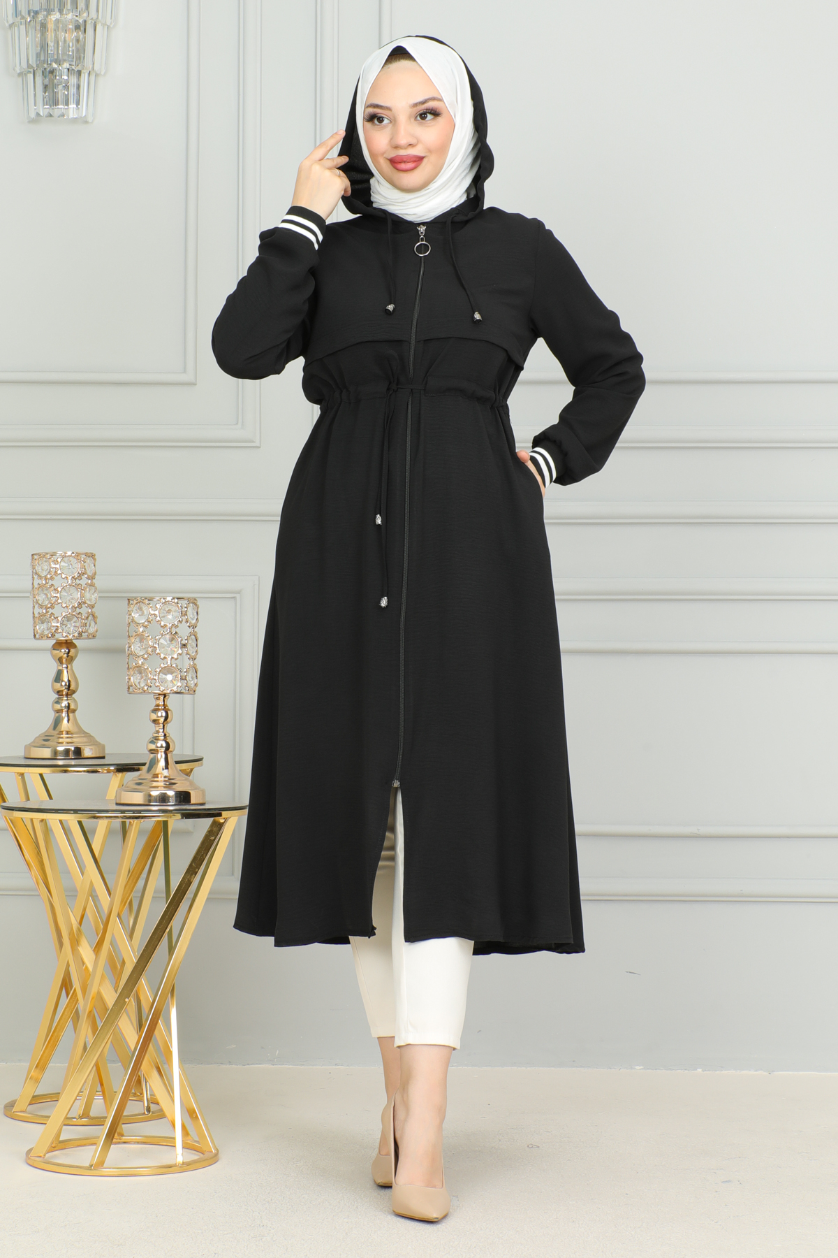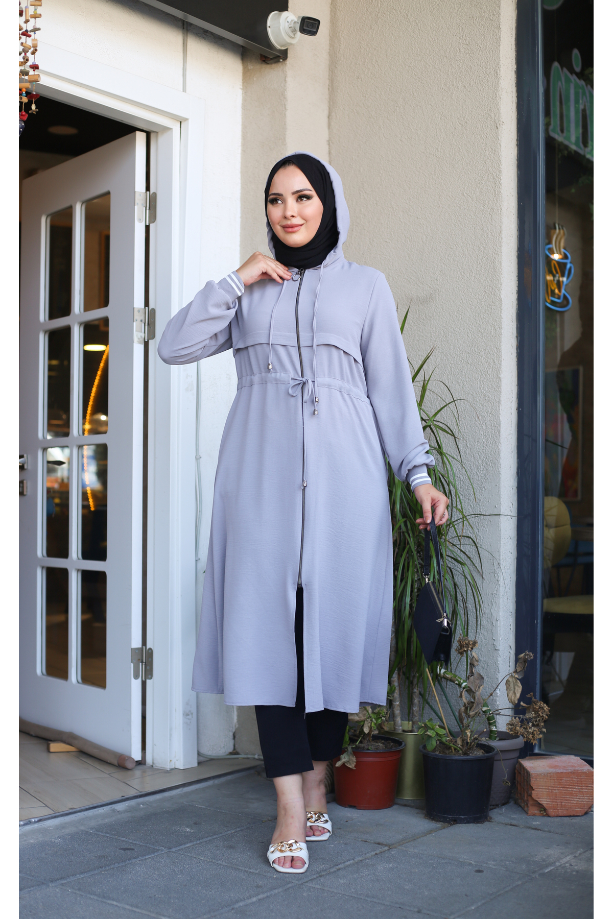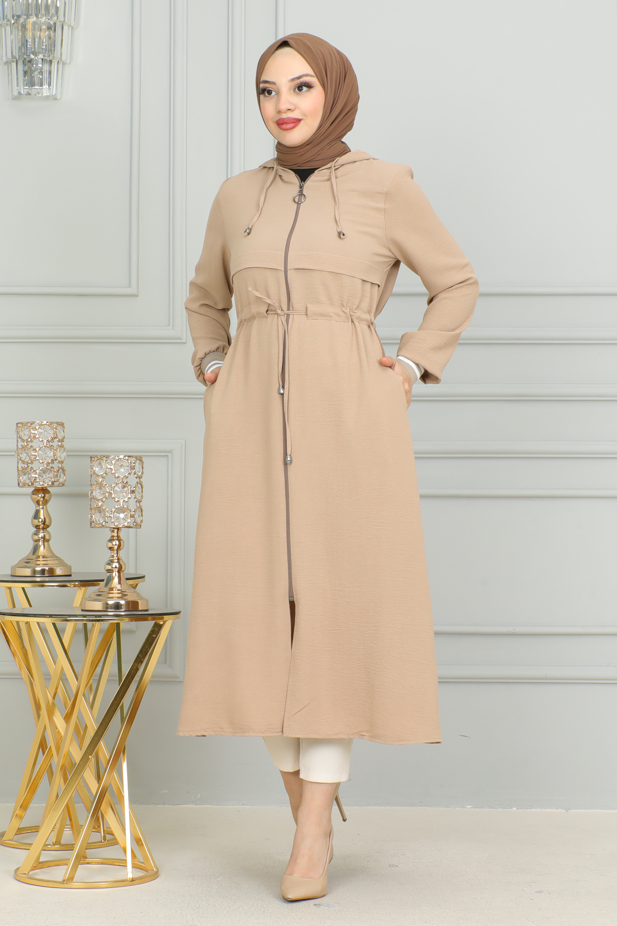 Uzun boy kesimi ile şık ve zarif bir görünüm kazandırırken, kapüşonlu yaka detayı modern bir dokunuş katmaktadır