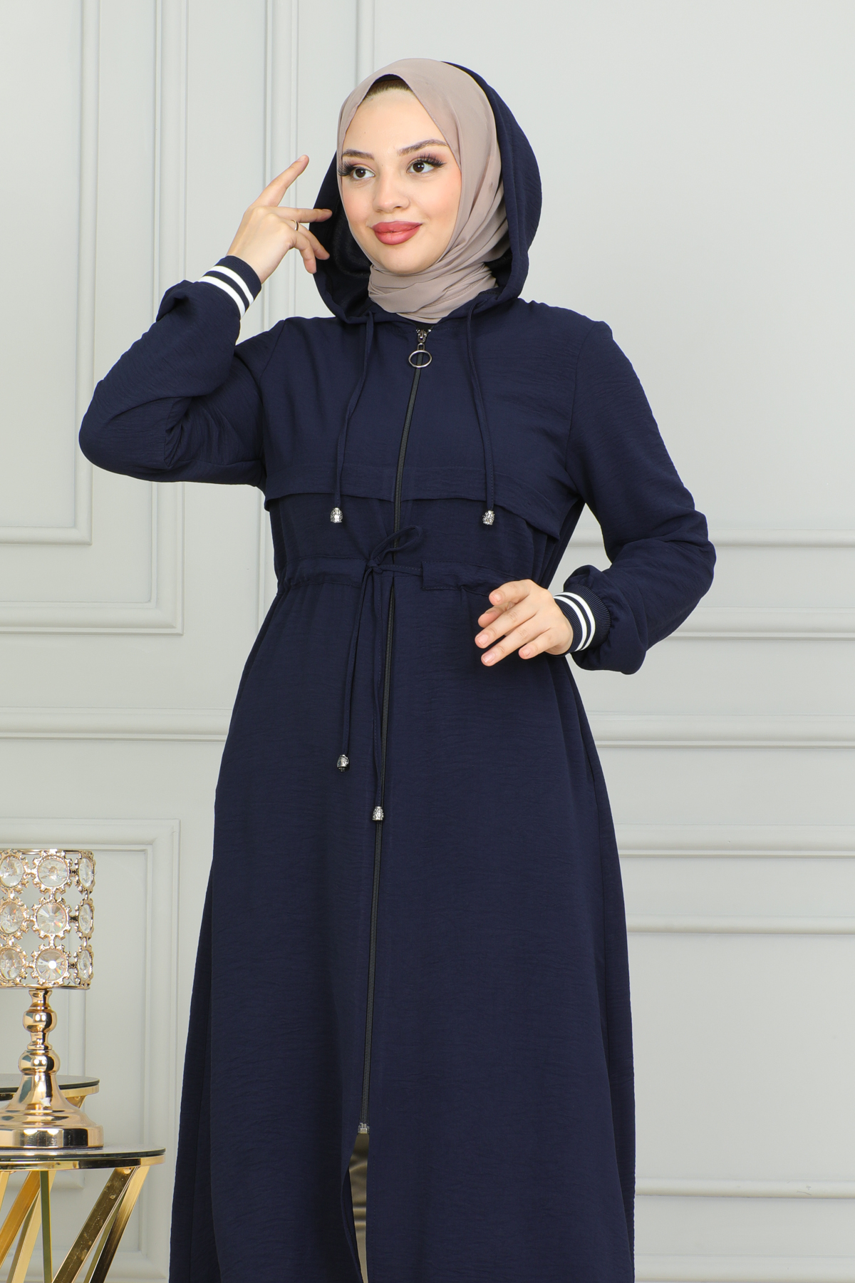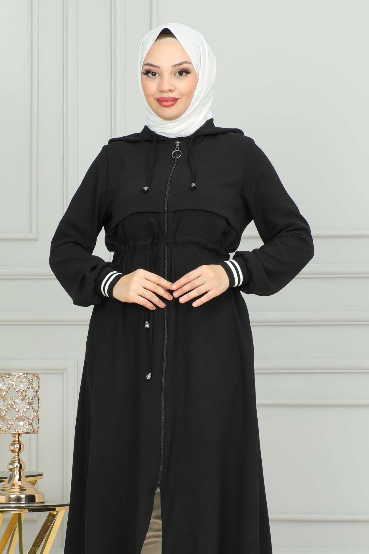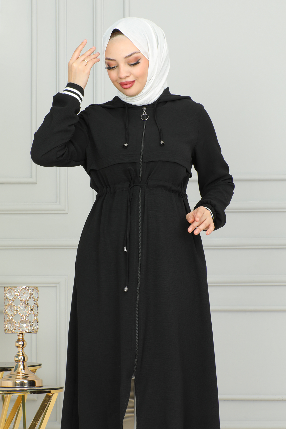 Uzun boy kesimi ile şık ve zarif bir görünüm kazandırırken, kapüşonlu yaka detayı modern bir dokunuş katmaktadır