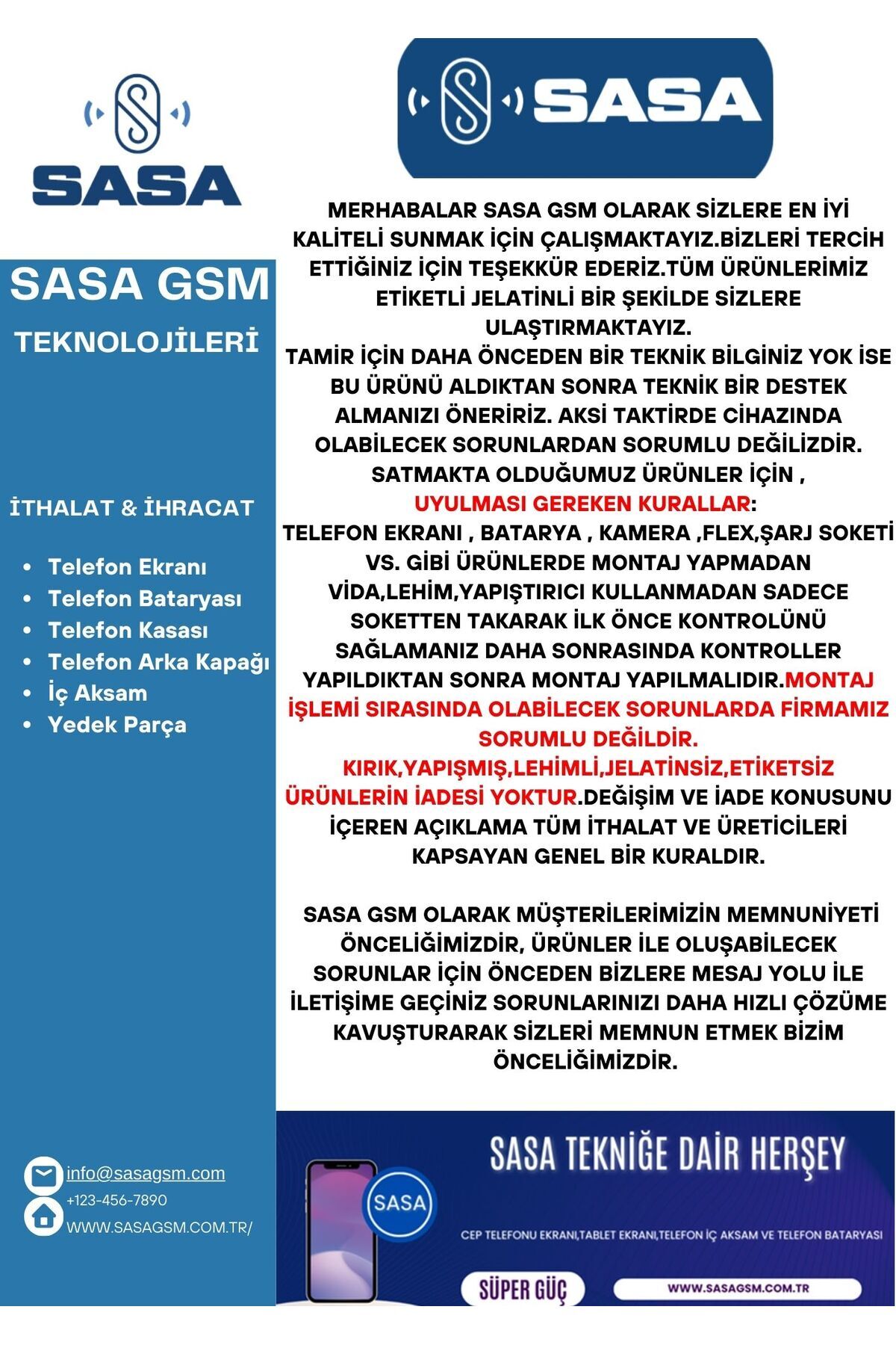 Montajı yapılmış, jelatini çıkarılmış, flexi kopmuş veya zarar görmüş ürünlerin iadesi veya değişimi olmayacaktır.
