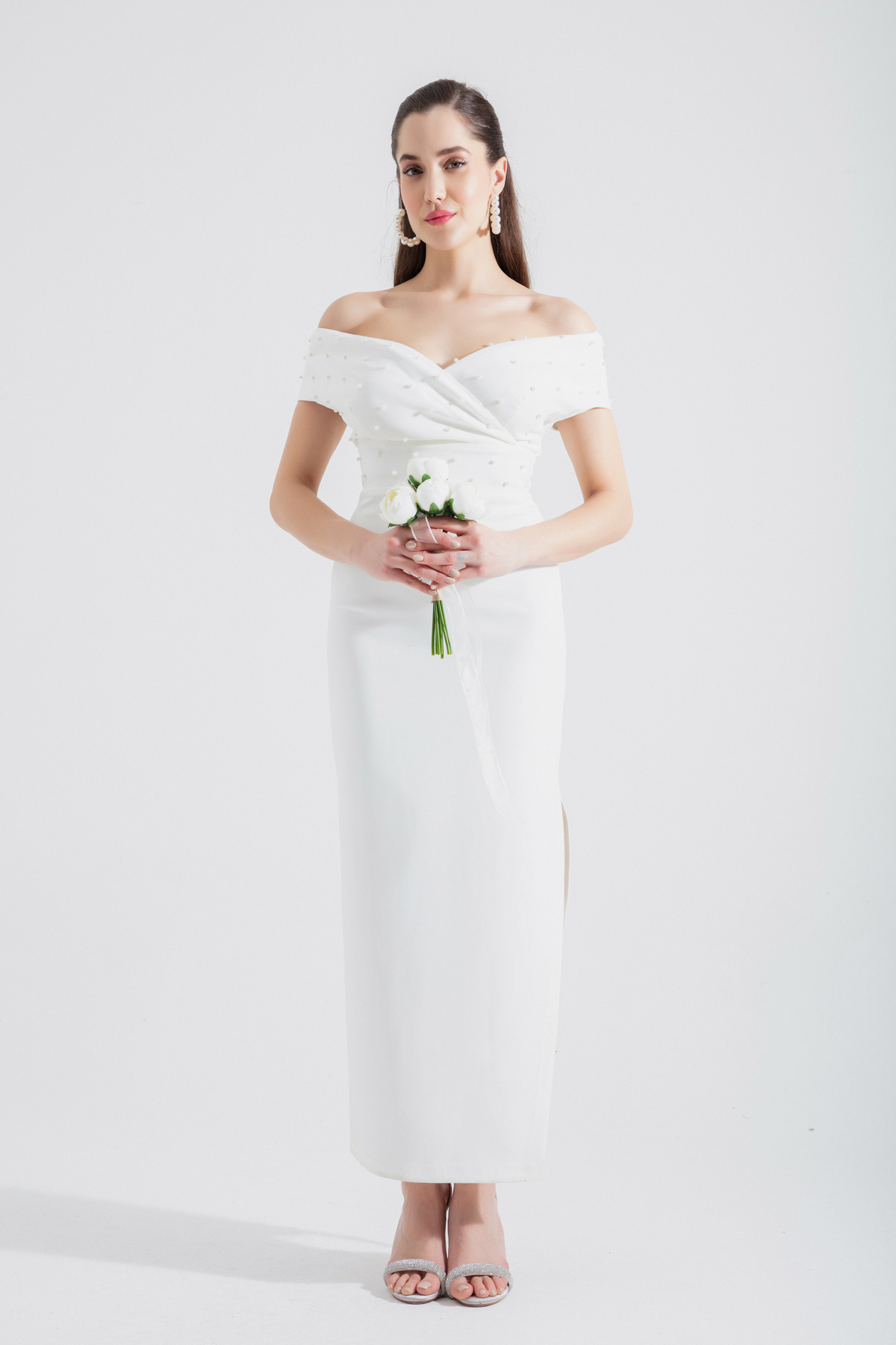 Ürün Özellikleri: Kruvaze yaka, göğüs gloplu, içi rengine uyumlu astarlı, yanı yırtmaçlı, gizli fermuar kapamalı, kadın incili midi abiye elbise.