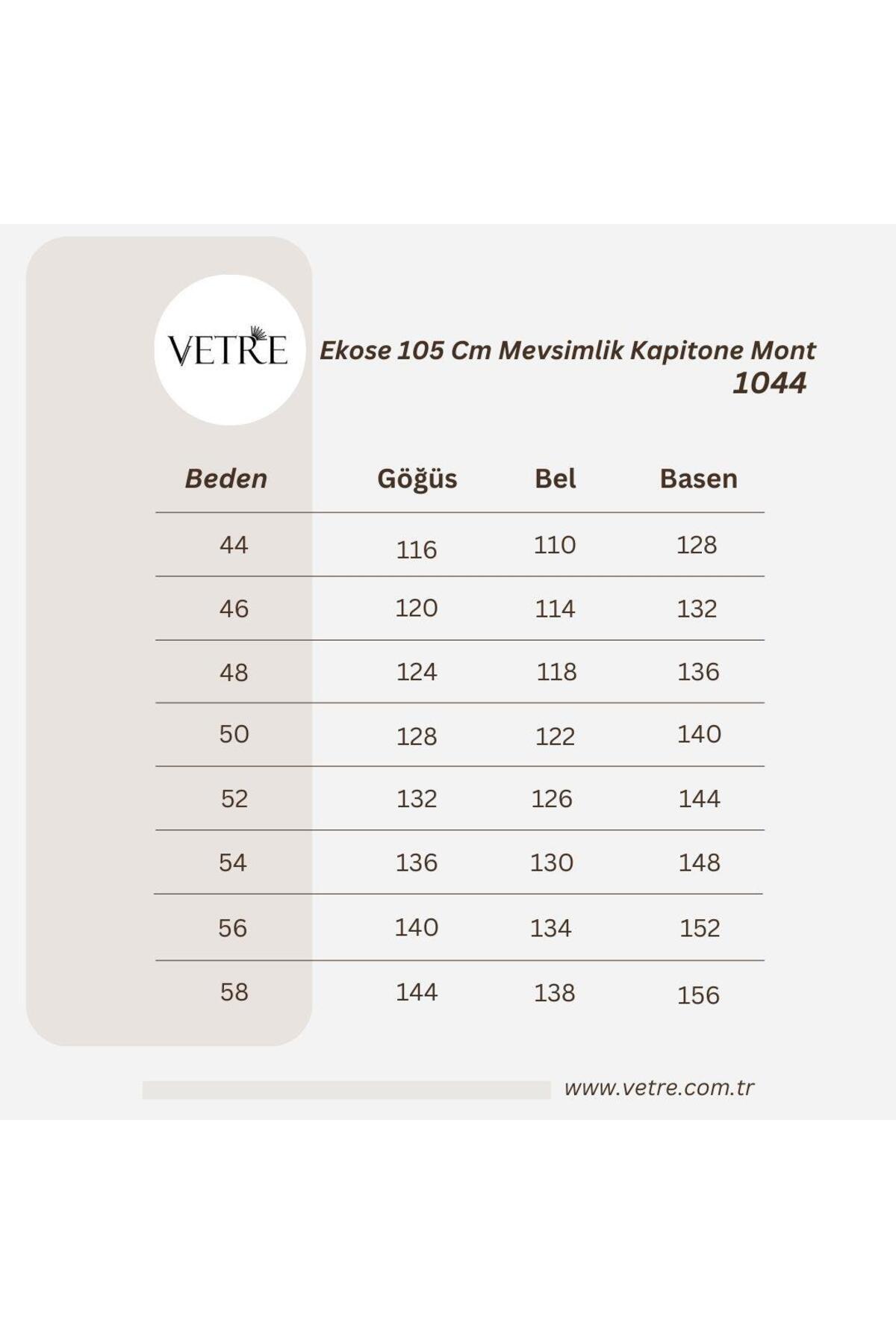 Ekose mevsimlik kapitone montumuzun siyah, lacivert, haki ve açık bej renkleri mevcuttur. 120 cm uzunluğunda olan ürünümüzün kapüşonu, cep ve çıtçıt detayı bulunmaktadır, kapüşonunu tercihe göre çıkararak kullanabilirsiniz. Montumuzu ön kısmında bulunan çıtçıt ve fermuar ile kapatabilirsiniz. Ürünümüz klasik kesim olup, 44-58 beden aralığındadır, beden tablosundan yardım alarak kendiniz için en uygun bedeni tercih edebilirsiniz. Montumuzun