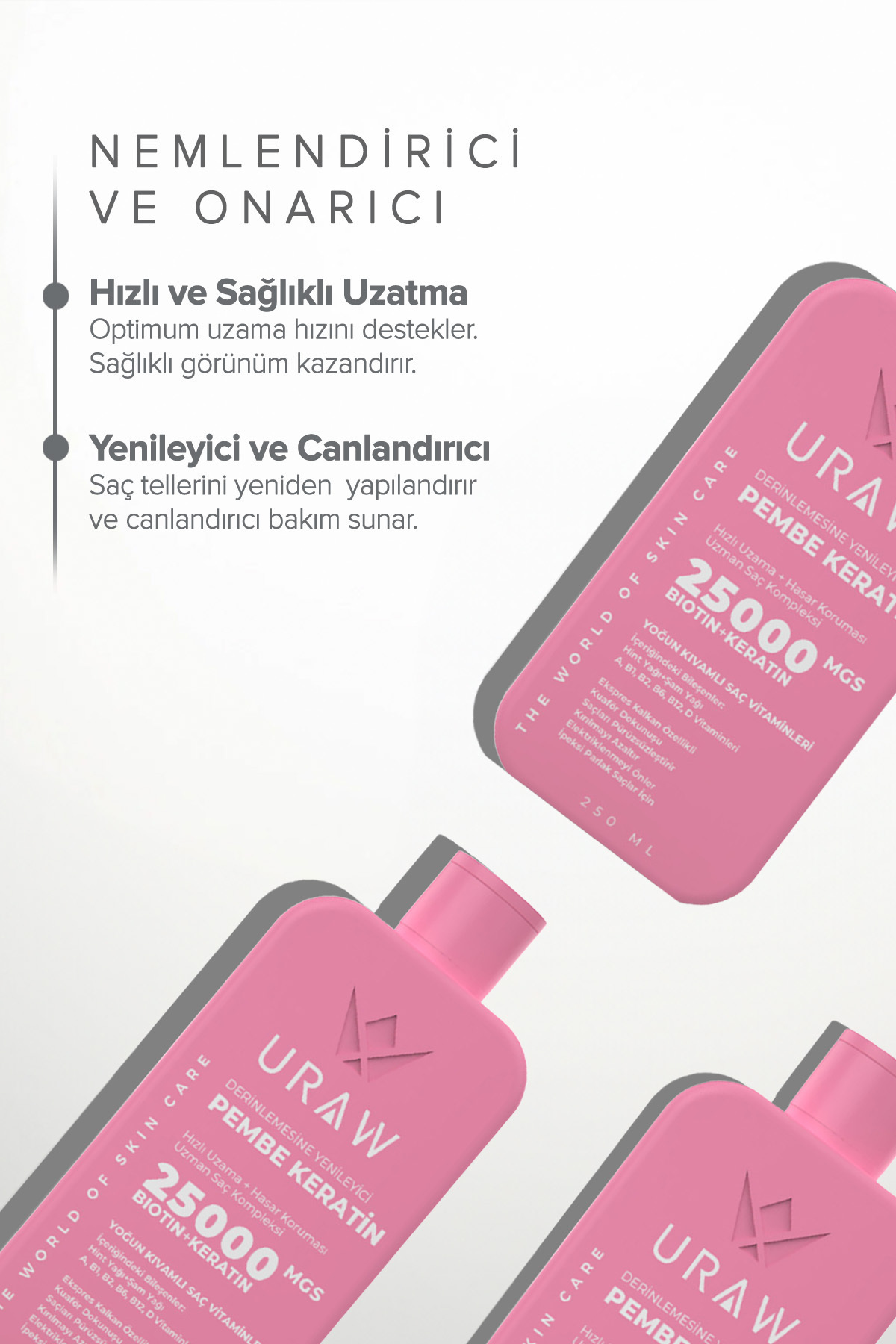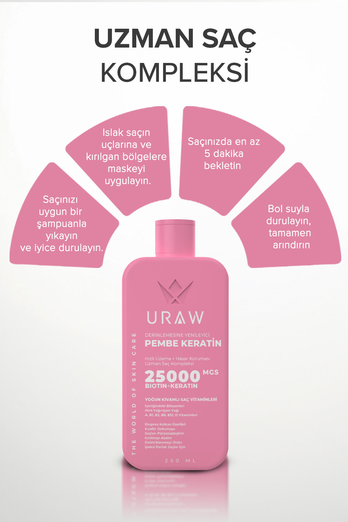 Düzenli kullanımda, Pembe Keratin saç maskesi saçlarınıza derinlemesine bakım , parlaklık ve canlılık kazandırarak sağlıklı uzamasına yardımcı olur! Kullanım Talimatı Saçınızı uygun bir şampuanla iyice yıkayın ve durulayın.