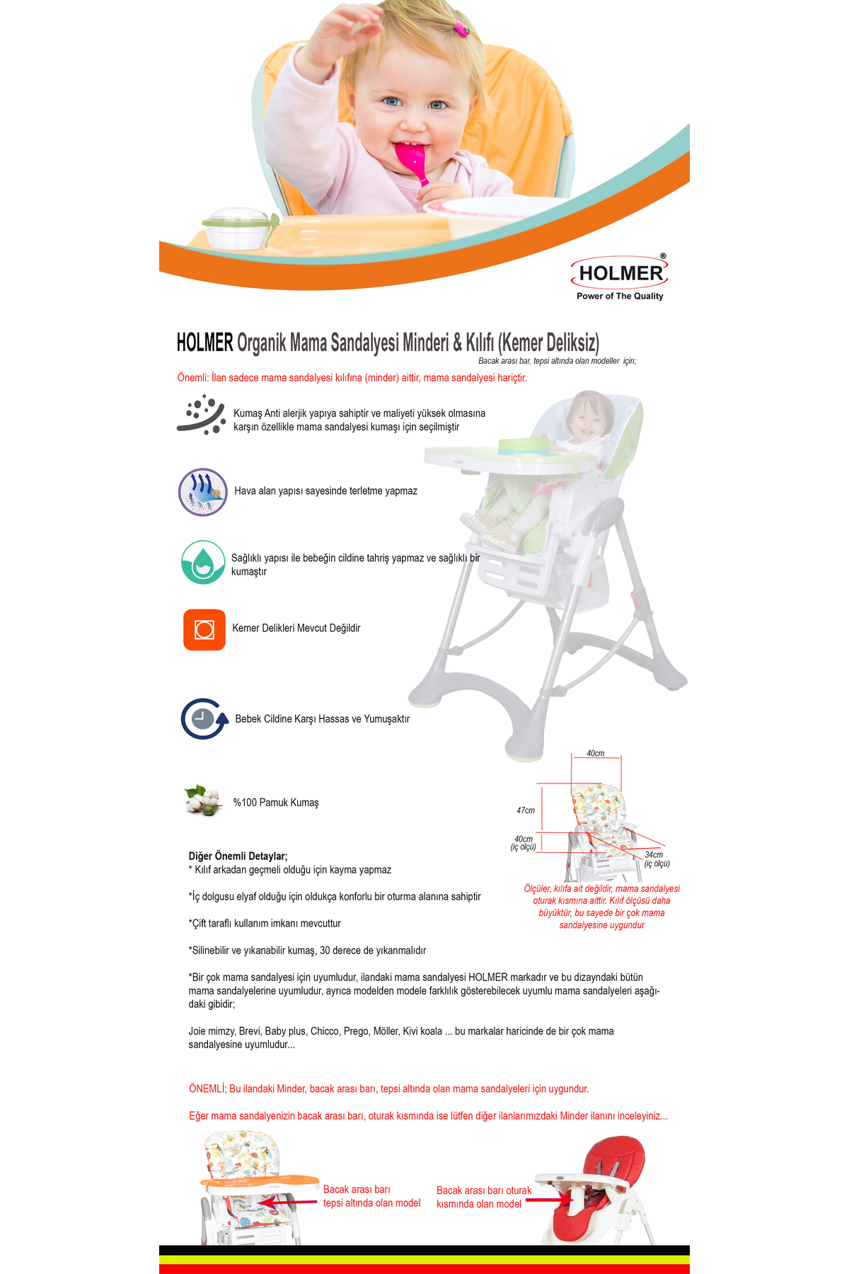 Kumaş Anti alerjik yapıya sahiptir ve maliyeti yüksek olmasına karşın özellikle mama sandalyesi kumaşı için seçilmiştir Hava alan yapısı sayesinde terletme yapmaz Sağlıklı yapısı ile bebeğin cildine tahriş yapmaz ve sağlıklı bir kumaştır Yapısı sayesinde Sıvı Geçirmez ve mama sandalyesi kılıfı olarak özellikle tercih Mama sandalyesi kılıfı için tercih sebebi olan diğer önemli unsur ise Leke Tutmamasıdır ki bu özellik bir çok kılıfta yoktur, HOLMER kalitesi ile kılıf özelliğinde mevcuttur Kalın yapısı sayesinde çok daha uzun yıllar kullanım süresi Pamuk içerik ile doğal kullanım *7 adet kemer geçme deliği vardır * Kılıf arkadan geçmeli olduğu için kayma yapmaz *İç dolgusu elyaf olduğu için oldukça konforlu bir oturma alanına sahiptir *Çift taraflı kullanım imkanı mevcuttur *Silinebilir ve yıkanabilir kumaş, 30 derece de yıkanmalıdır *Bir çok mama sandalyesi için uyumludur, ilandaki mama sandalyesi HOLMER markadır ve bu dizayndaki bütün mama sandalyelerine uyumludur, ayrıca modelden modele farklılık gösterebilecek uyumlu mama sandalyeleri aşağıdaki gibidir