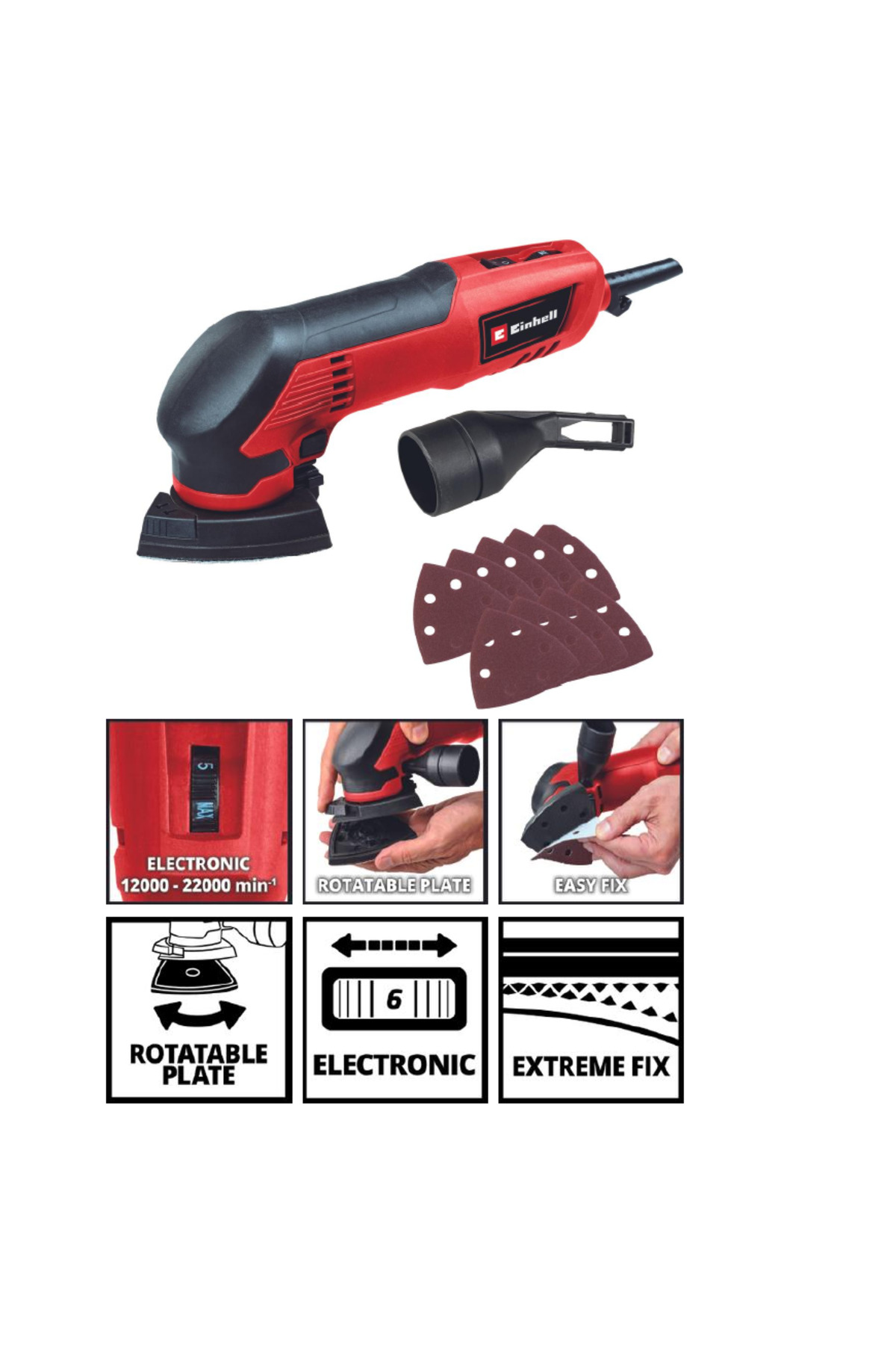 200 W Einhell delta zımpara TC-DS 20 E ahşap, plastik ve metal zımparalamak için kullanışlı, kompakt bir alettir. Uzun çalışma süresi ile üçgen zımpara makinesi, özel DIY kullanıcılarına iyi hizmet eder. Zımpara plakasının şekli özellikle köşeli, ulaşılması zor alanların zahmetsizce işlenmesi için uygundur ve delta zımpara plakası da buna yardımcı olmak için 3 konumda döndürülebilir. Zımpara pabucunun üç kenarının her biri 93 mm uzunluğundadır. Hız kontrol elektroniği, her görev için hassas güç uyarlaması sağlar. Zımpara makinesi 2 mm'lik bir salınım devresi ve 12.000 ile 22.000 rpm arasında bir salınım sayısı ile çalışır. Zımpara pabucu, çeşitli zımpara kağıtlarının saniyeler içinde değiştirilebildiği ve zımparalama sırasında güvenli bir şekilde sabit kaldığı Velcro sabitleme ile donatılmıştır. Ergonomik tasarım ve yumuşak kavrama, delta zımpara makinesinin elde en iyi ve sağlam şekilde durmasını sağlar. Temiz, tozsuz çalışma için, delta zımpara, ekstraksiyon için bir Einhell ıslak / kuru elektrikli süpürgeyi bağlamak için bir adaptöre (Ø 36 mm) sahiptir. Çalışmaya hemen başlayabilmeniz için 9 adet zımpara kağıdı (2x K60, 2x K120, 2x K240, 3x K400) teslimata dahildir. Sarmal kabloyu sabitlemek için kablo klipsi sayesinde delta zımpara her zaman düzgün ve güvenli bir şekilde saklanır.