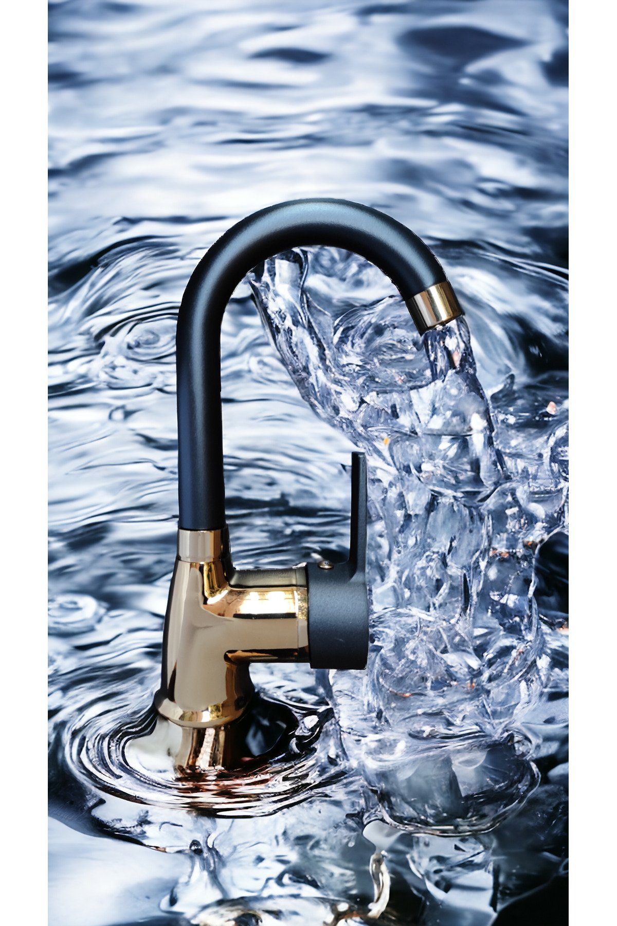 ? **Modern Tasarımlı Siyah ve Altın Renkli Banyo Lavabo Bataryası** Banyonuza şıklık ve işlevsellik katmak için ideal olan bu lavabo bataryası, göz alıcı siyah ve altın renkleriyle dikkat çekiyor.