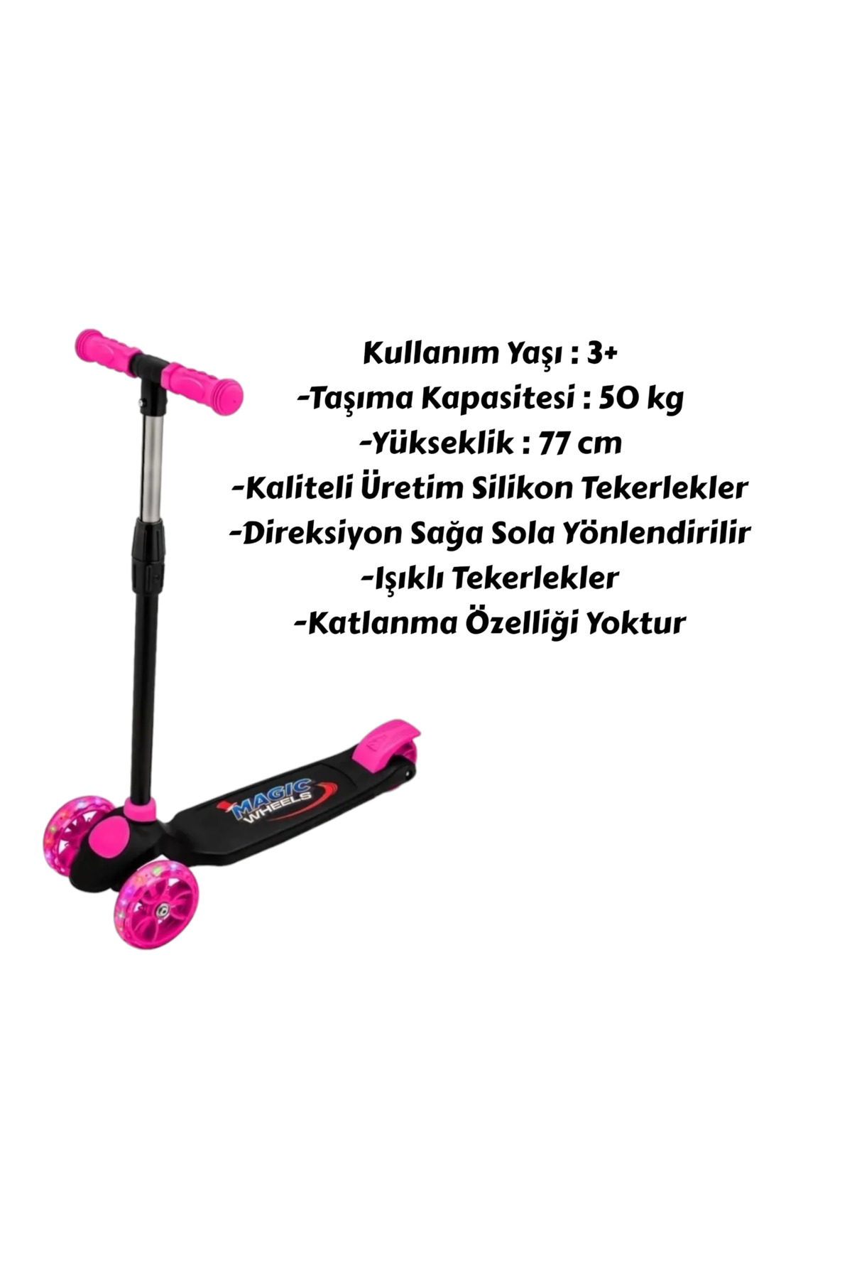 Scooter'ın Taşıma kapasitesi 50 KG'dır. Scooter'ın 3 kademe boy ayarı vardır. (65 , 70 , 77 cm arası boy seviyesi ayarlanabilir. )
