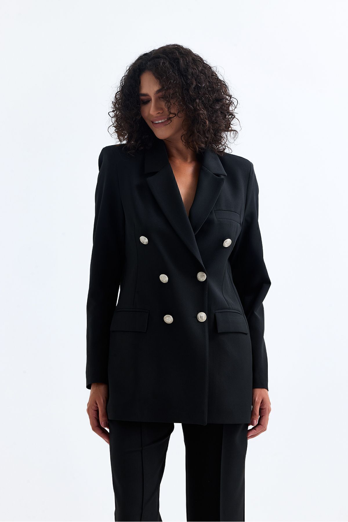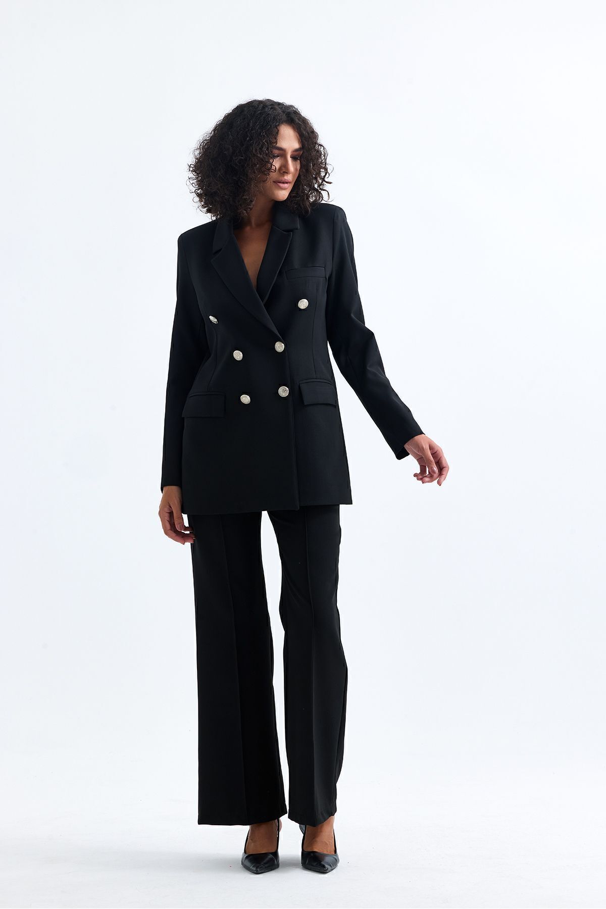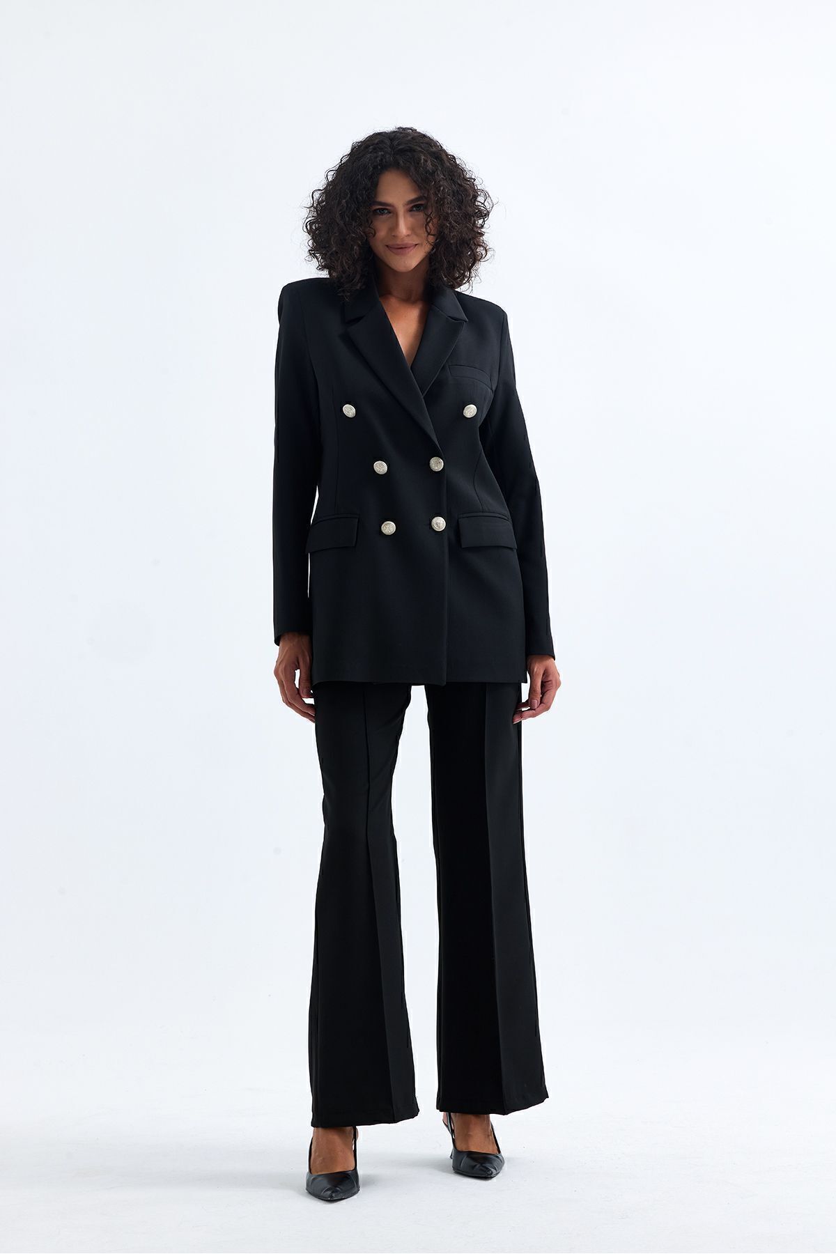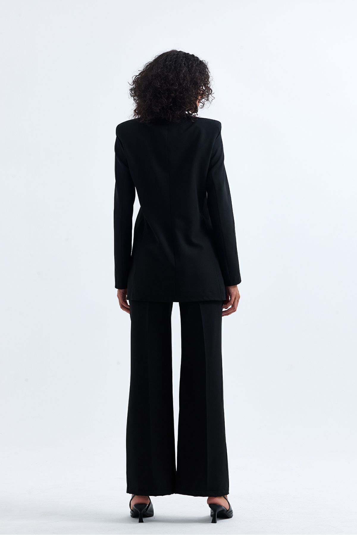 Düz deseni ve siyah rengiyle zamansız bir tarz sunar