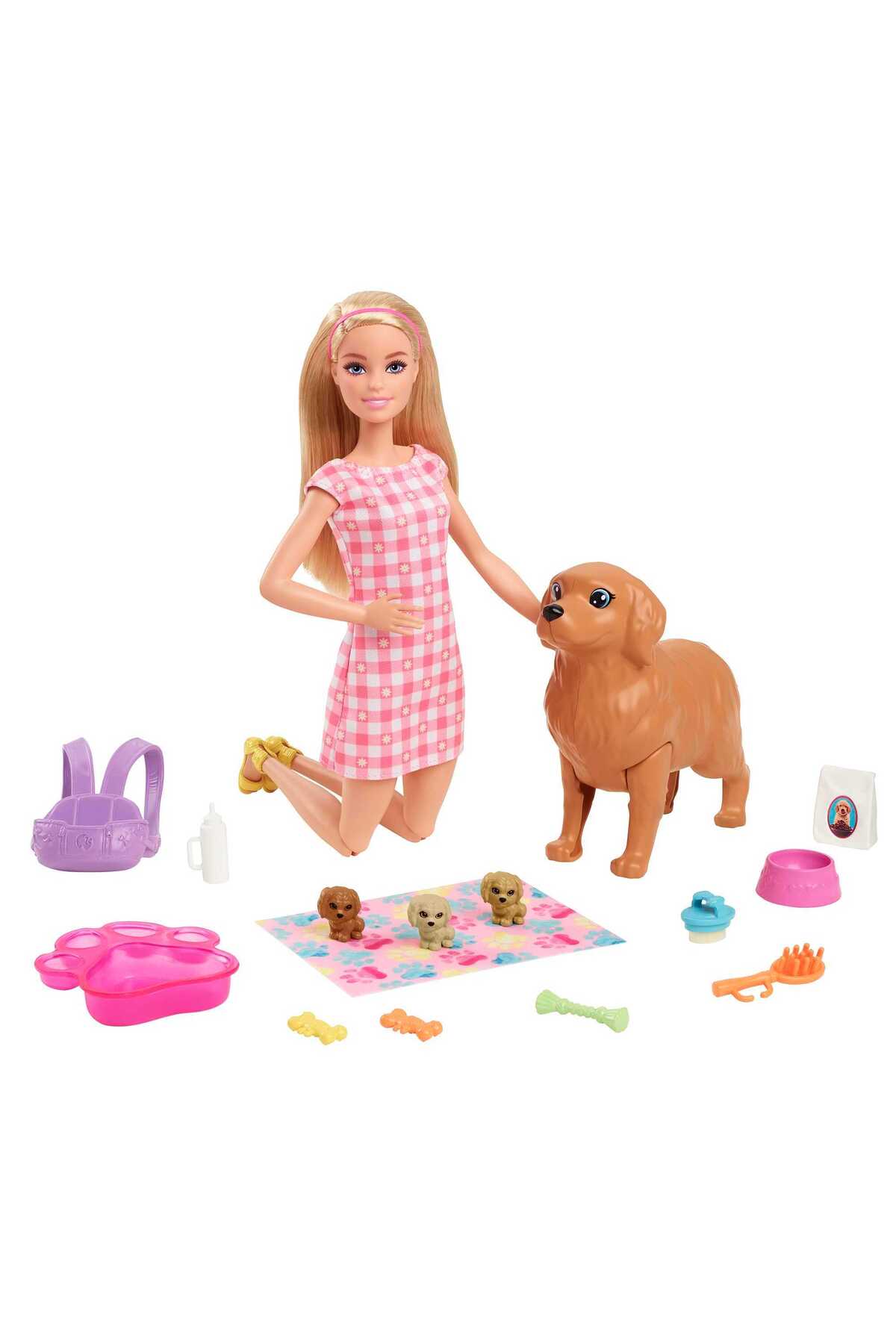 Mama kabı, tasmalar, evcil hayvan yatağı ve ellerine tam oturan tasma kayışı ile Barbie, sevimli dostlarına bakmak için ihtiyacı olan her şeye sahiptir.
