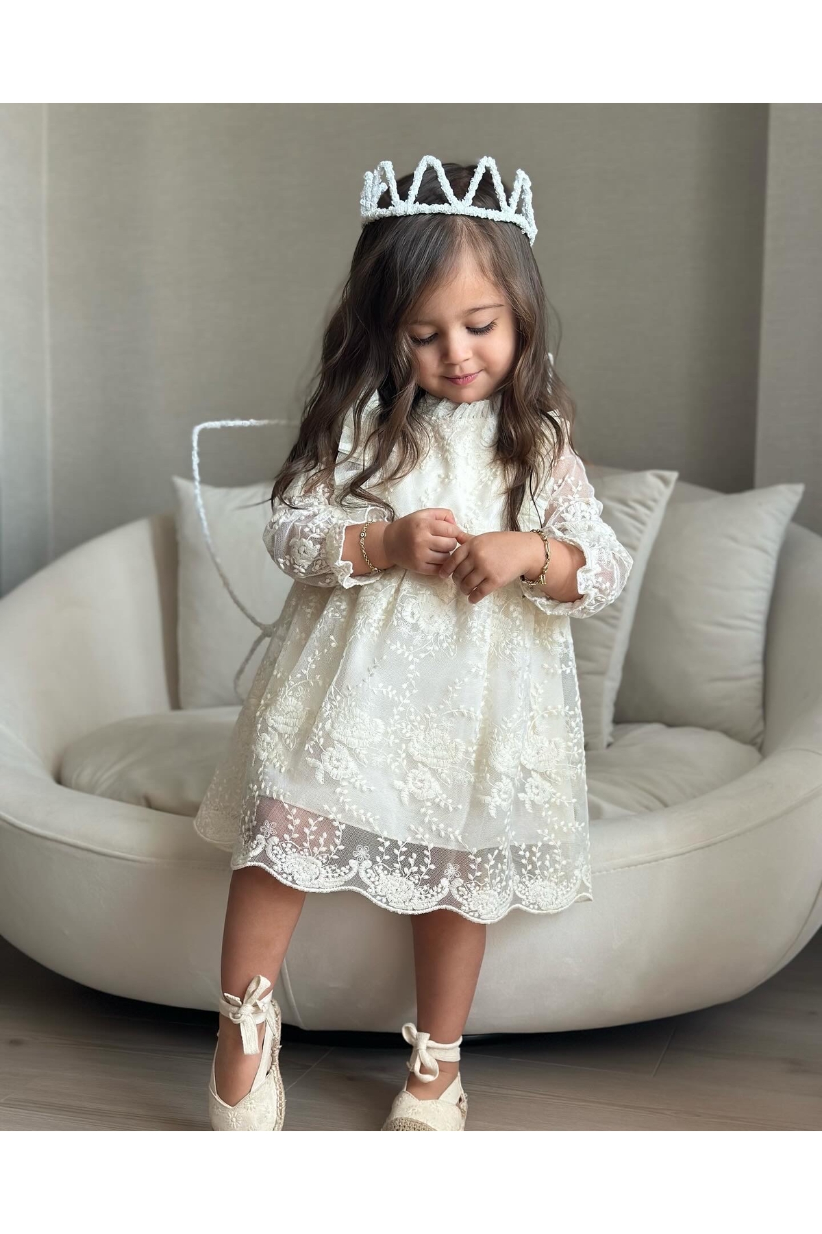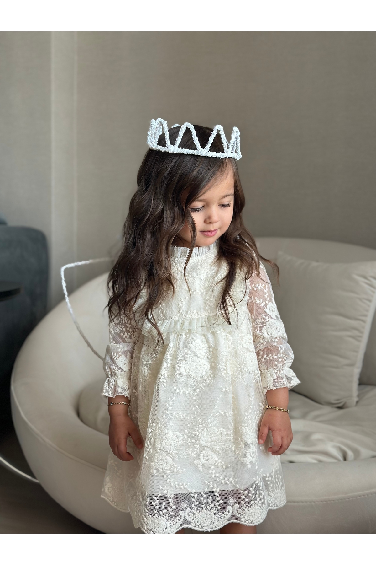 Beyaz mat kumaştan üretilmiştir Tacın arkasındaki kurdele sayesinde baş çevresine göre ayarlama yapılabilmektedir
