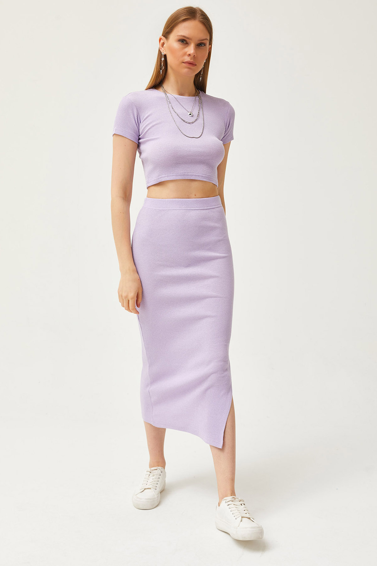 Yırtmaç detayı ile feminen bir dokunuş katarken, beli lastikli yapısı konforlu bir kullanım sağlar