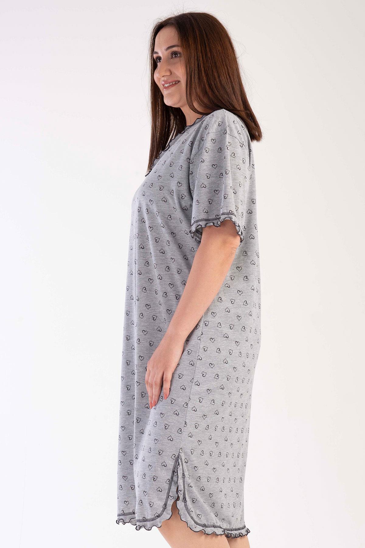 V yaka tasarımıyla öne çıkan bu gecelik, gri renkte ve üstünde hoş desenlerle süslenmiştir.