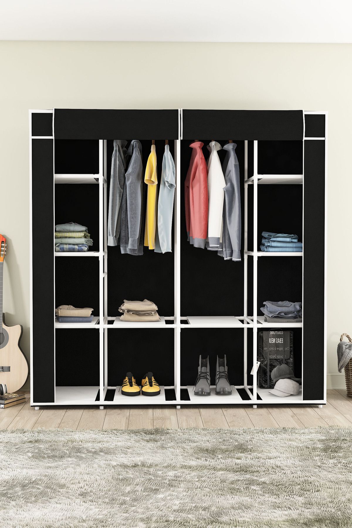 Ürün içeriği: 1- Ürün iskeleti için gerekli borular 2- Ürün iskeletinin bağlantısı için bağlantı aparat seti 3- Raflar için gerekli raf bezleri 4- Dış koruması için dış kılıf bezi 5- Askılıkların asılması için gerekli askı aparatı.