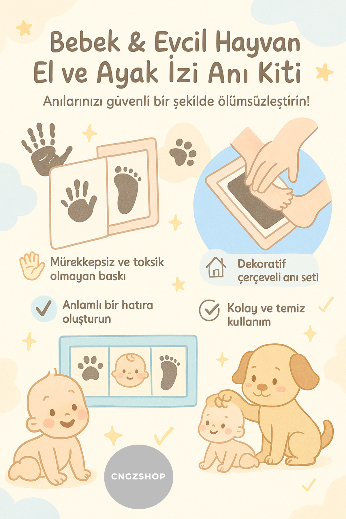 Bebek & Evcil Hayvan El ve Ayak Pati İzi Anı Albüm Seti | Mürekkepsiz Bebek Baskı Kiti | Fotoğraf Çerçeveli Hatıra Seti Bebeğinizin en özel anlarını sonsuz bir hatıraya dönüştürün! Bu Bebek El ve Ayak İzi Fotoğraf Çerçevesi Seti, bebeğinizin el ve ayak izlerini güvenli bir şekilde almanıza ve onu ömür boyu saklamanıza olanak tanır.