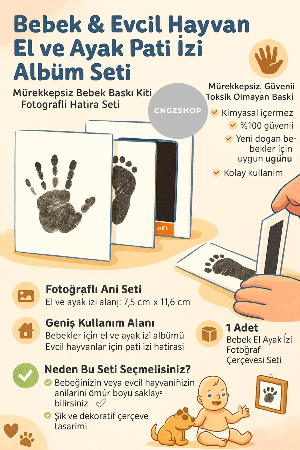 🏡 Geniş Kullanım Alanı Bebekler için el ve ayak izi albümü Evcil hayvanlar için pati izi hatırası Hediye olarak baby shower, doğum günü veya özel günlerde sevdiklerinize sunabilirsiniz Evinizde hatıra köşesi veya duvar dekoru olarak değerlendirebilirsiniz 📦 Paket İçeriği 1 Adet Bebek El Ayak İzi Fotoğraf Çerçevesi Seti Mürekkepsiz, güvenli baskı kitli 🌟 Neden Bu Seti Seçmelisiniz? ✅ Bebeğinizin veya evcil hayvanınızın anılarını ömür boyu saklayabilirsiniz ✅ Mürekkepsiz, toksik olmayan güvenli baskı ✅ Yeni doğan bebekler için uygun boyut ve kullanım kolaylığı ✅ Şık ve dekoratif çerçeve tasarımı ✅ Hediye için ideal, anlamlı ve kalıcı bir seçenek ✅ Evde veya profesyonel fotoğraf çekimlerinde rahatlıkla kullanılabilir