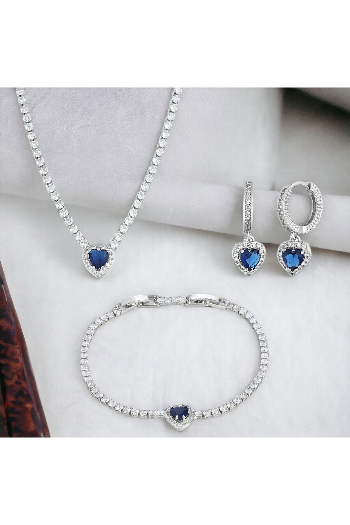 Kolye, küpe ve bileklikten oluşan set halinde sunulur, uyumlu bir kombinasyon oluşturur