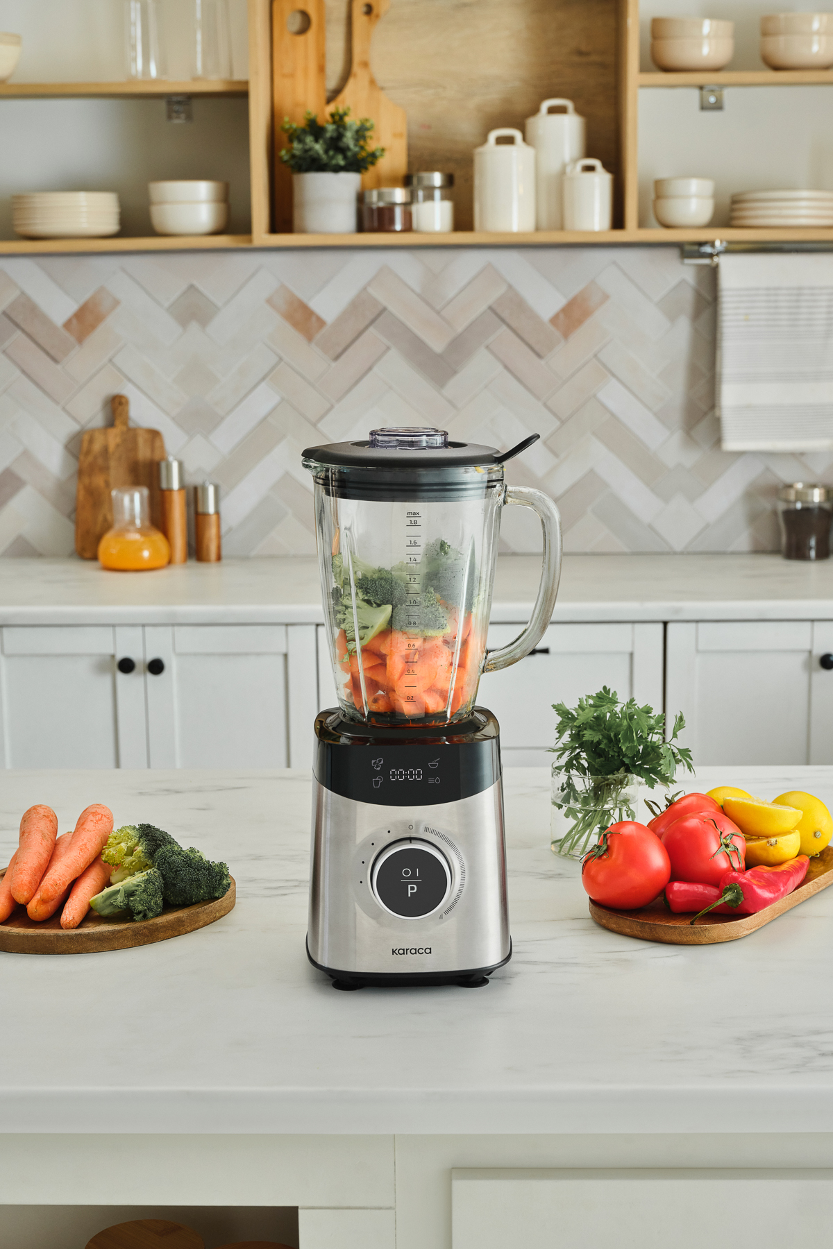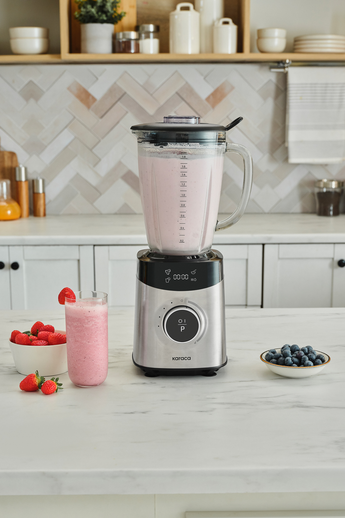 Karaca Dijital Ekran Inox Smoothie Blender, güçlü 1800 W motoru ve 1.8 L geniş cam haznesi ile hem günlük kullanım hem de profesyonel performans sunar. Smoothie’den frozenlara, buz kırmadan milkshake’e kadar tüm tariflerinizi tek cihazla hızlı ve pratik bir şekilde hazırlayabilirsiniz.