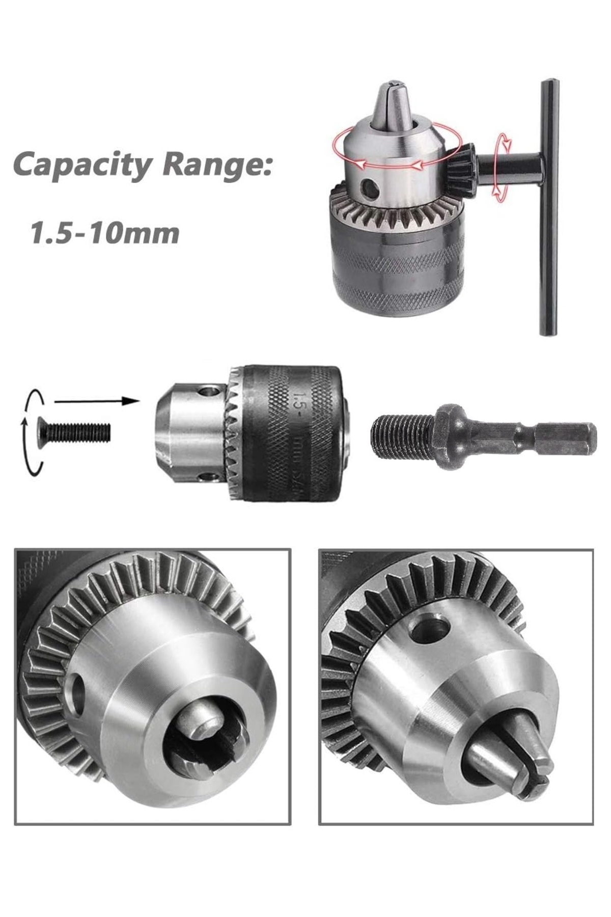 10 mm Matkap aynası toplam boyutu: 57 x 33 mm/2,24 x 1,3 inç (U*D) Anahtar Boyutu: 55 x 34 x 13 mm/2,17 x 1,34 x 0,51 inç (U*G*Y) Adaptör Toplam Boyutu: 56 x 14 mm/2,2 x 0,55 inç (U*D) Adaptör Yiv Boyutu: M10 x 15 mm Adaptör Şaft Boyutu: 6,3 x 27 mm/0,25 x 1,06 inç (D*U) Adaptör Malzemesi: 40 cr Şaft Tipi: Altıgen Şaft