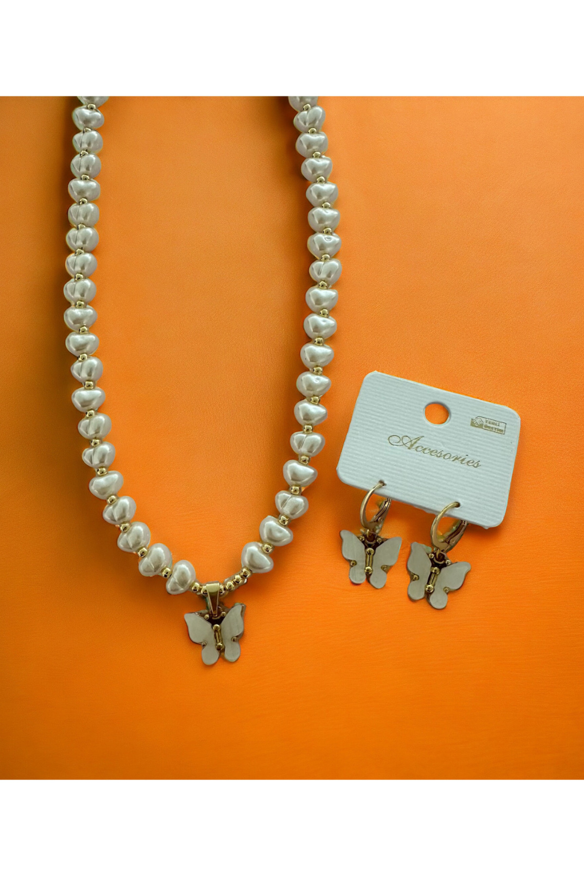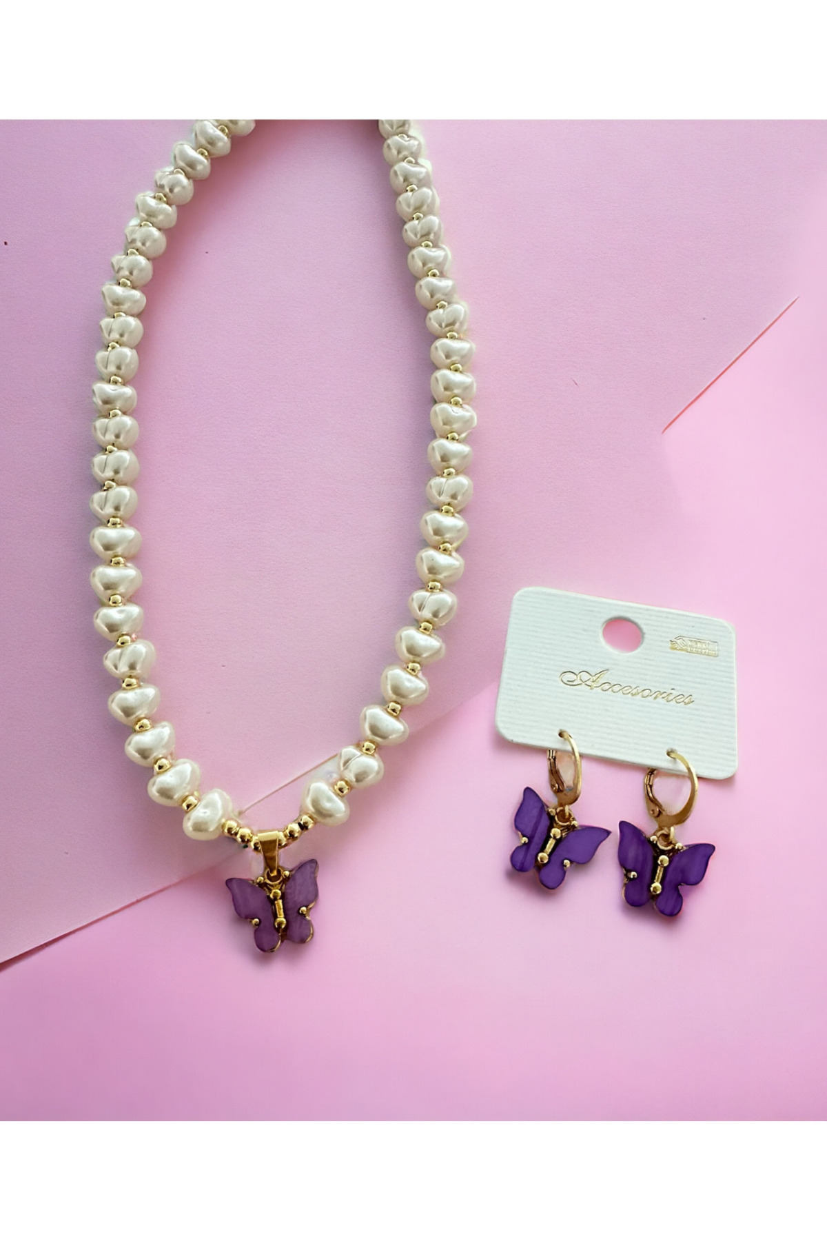 Kolyemiz ve küpe çiftimiz mor-pembe kelebekli ve incili şık bir görünüme sahiptir.