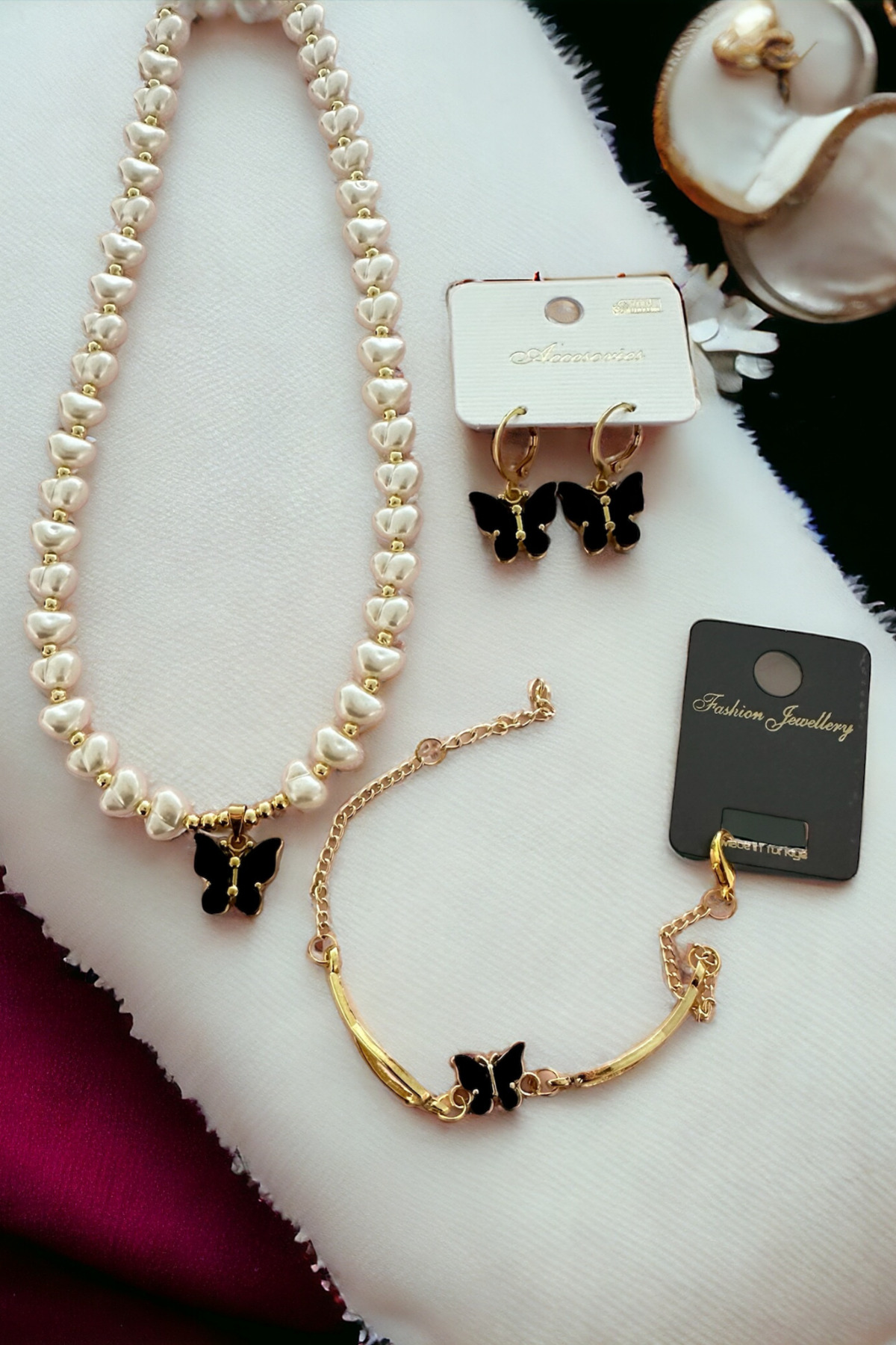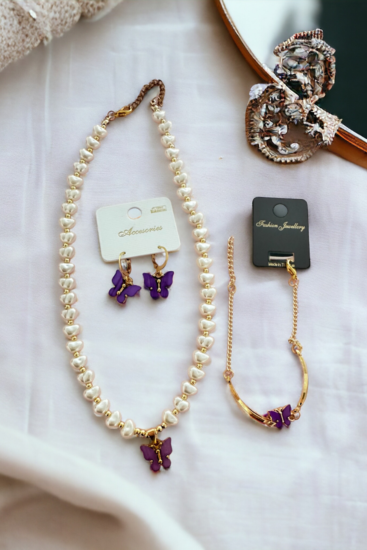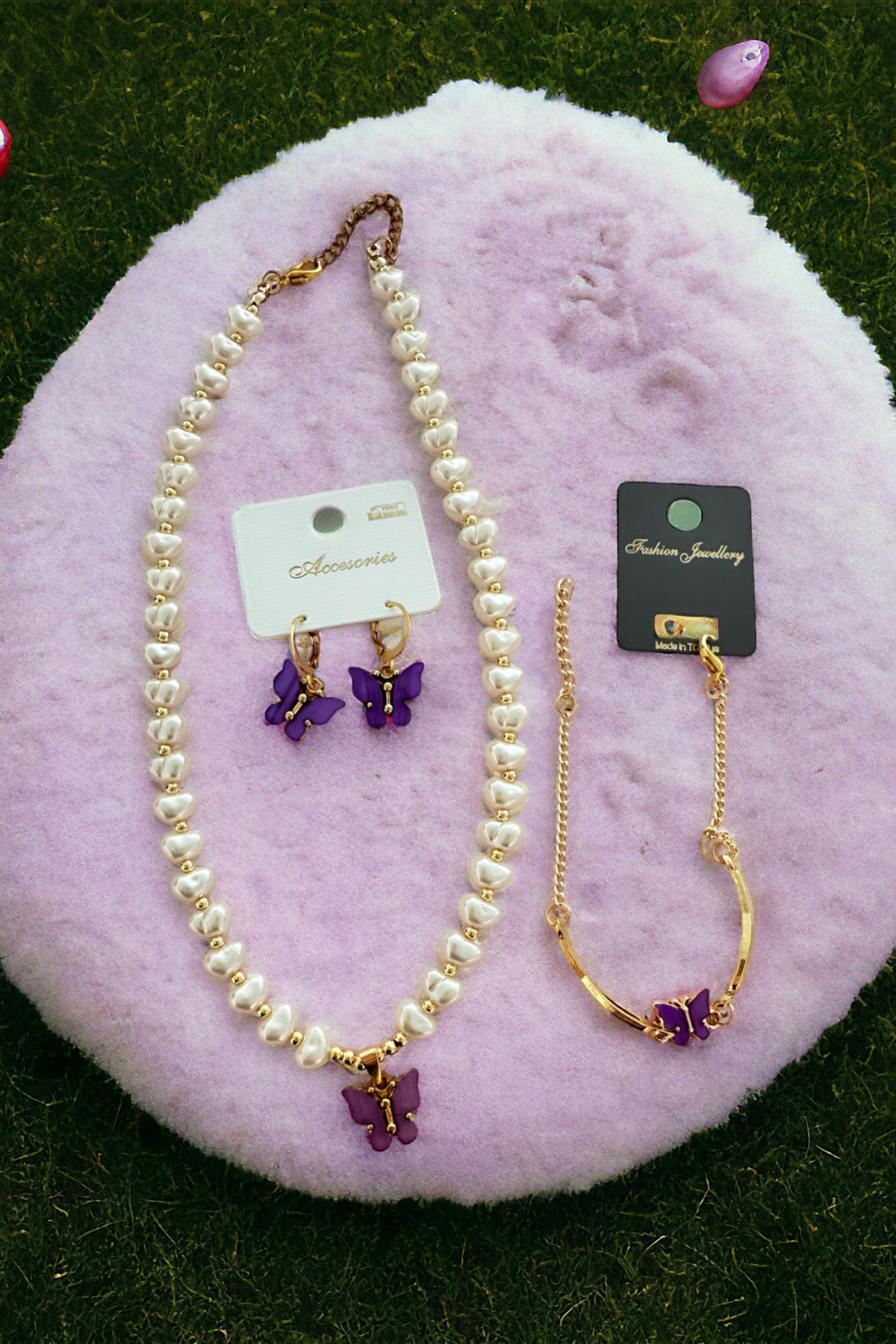 Sevgilinize, annenize, arkadaşınıza, kardeşinize alabileceğiniz mor kelebekli incili kadın kolyesi ve gold renkli mor kelebekli bileklik ve küpe çifti.