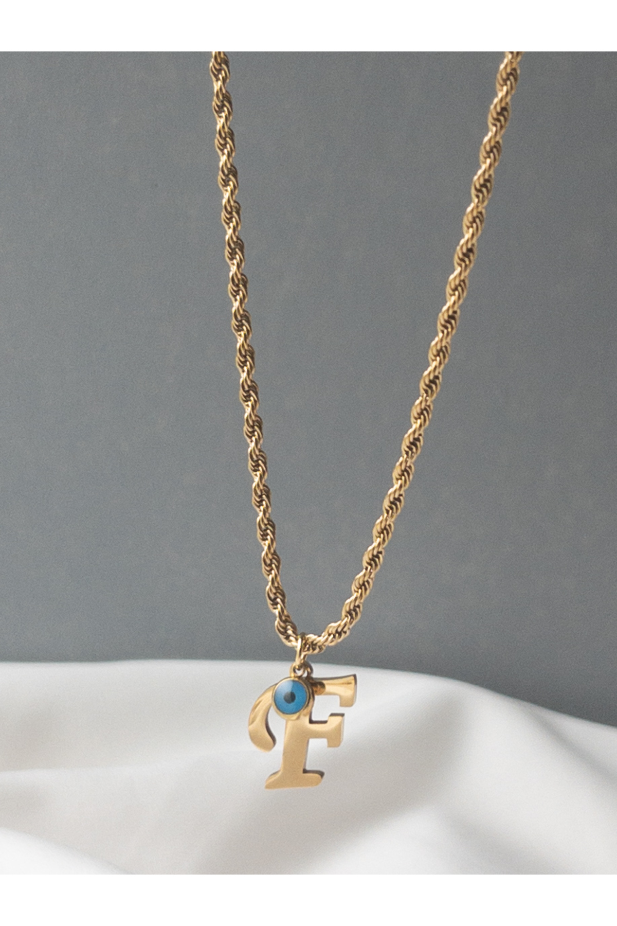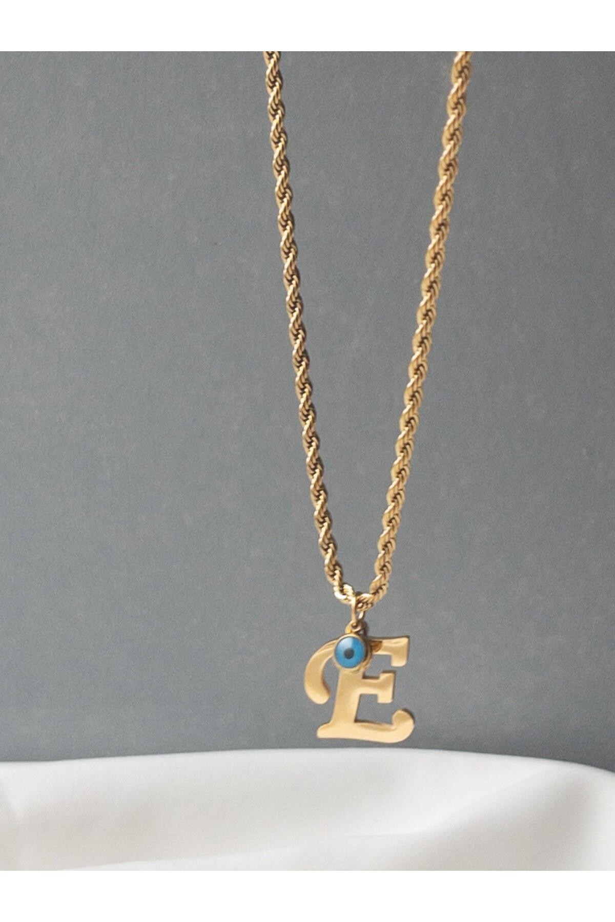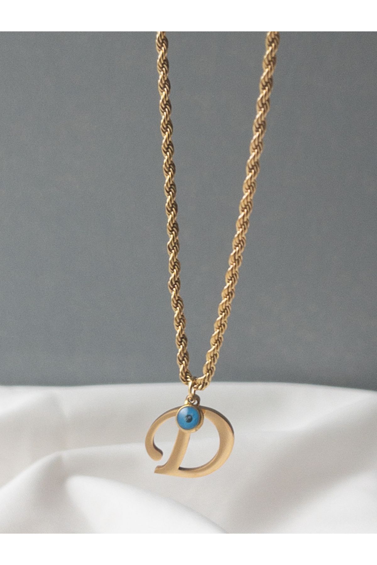 316L Kararmaz Çelik Gold Renk Nazar Boncuklu Uzun Burgu Zincirli Harfli Kadın Kolye
