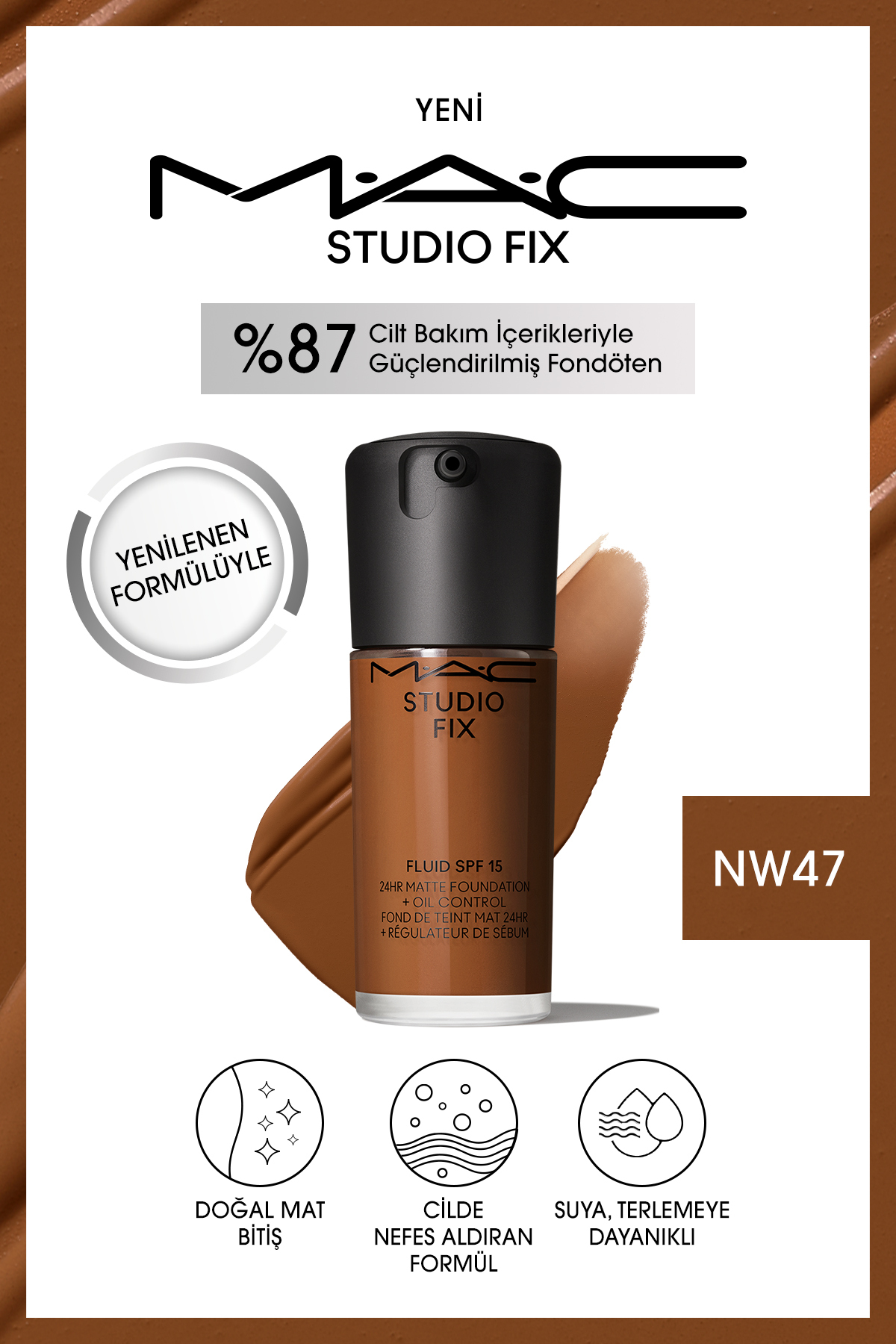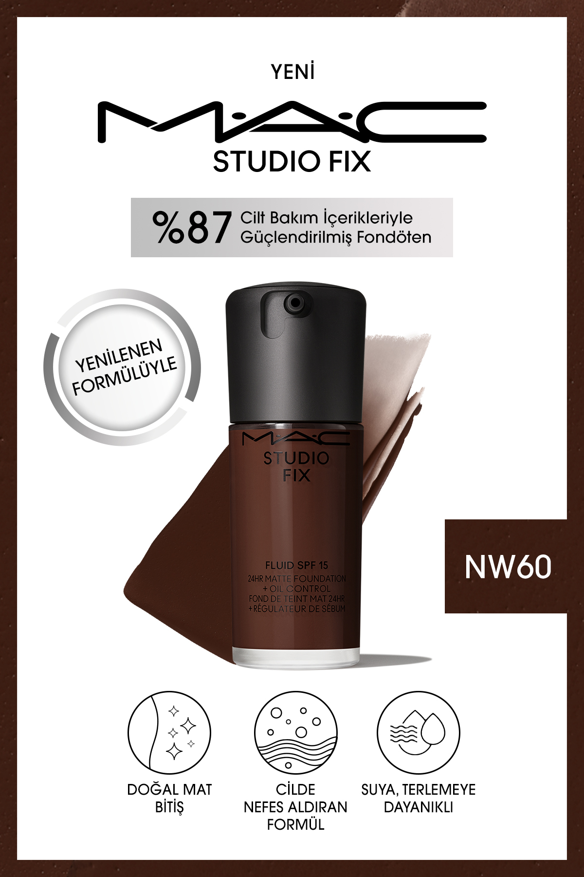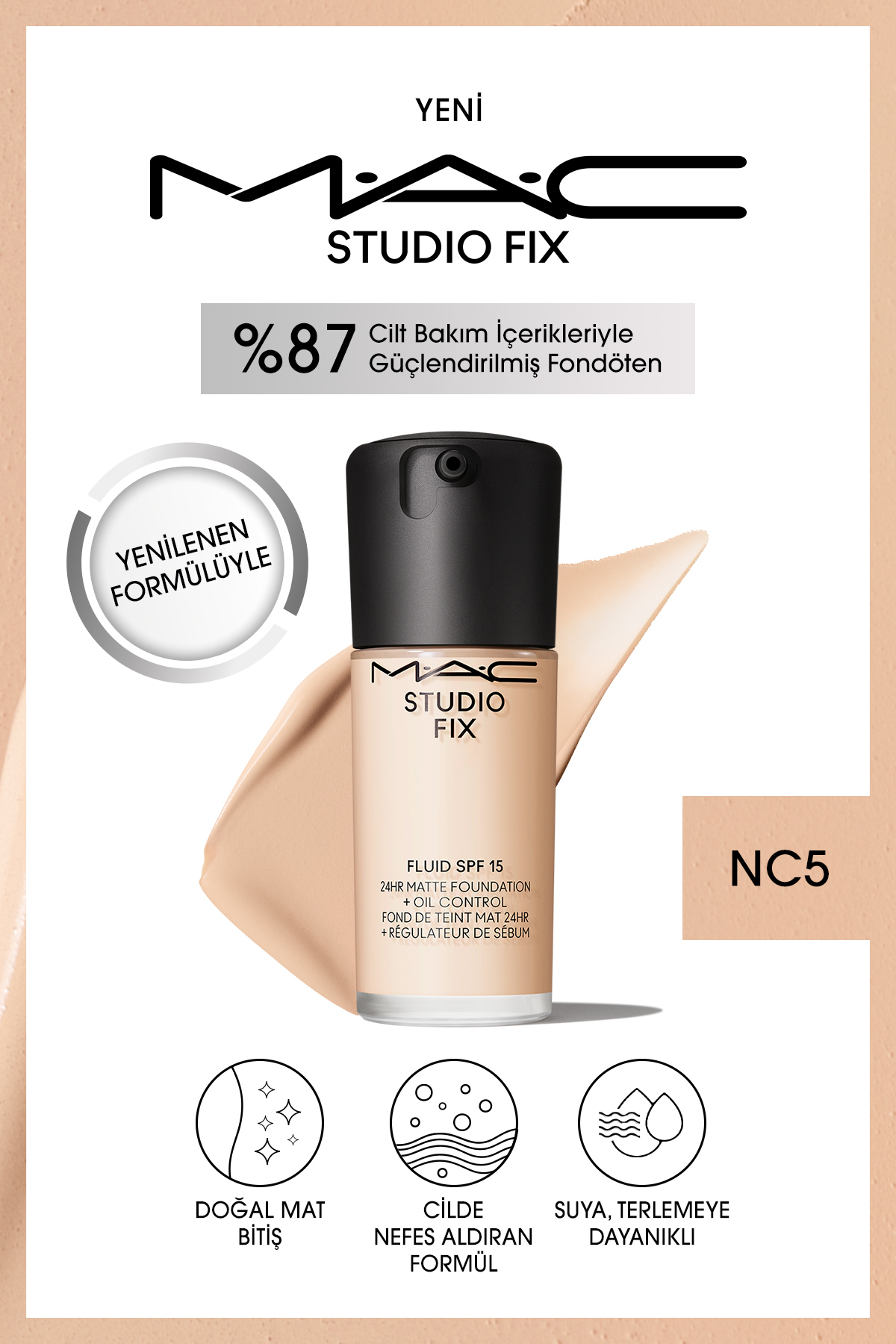 Orjinal M·A·C Fondöteni, şimdi geliştirilmiş formülü ve kolay uygulanabilen pompası ile keşfet! 24 saate kadar kalıcı, üst üste uygulanabilen kapatıcılık sunan ikonik fondöten şimdi doğal mat bitişli cilde nefes aldıran formülü ve 71 farklı renk seçeneği ile tüm cilt dokuları ve tonları için yenilendi.